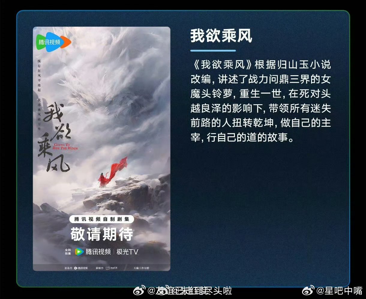 🍉🐧修仙剧《我欲乘风》田曦薇,任豪改编自归山玉的仙侠小说《灭了天道后我成了死对头的师妹》,女强修仙小说《逐玉》女主男二二搭,好全的演出名单,就有点像真的,反正田曦薇《嫁金钗》也搭闫桉,搭任豪也不意外,平台应该挺看好田曦薇单扛的