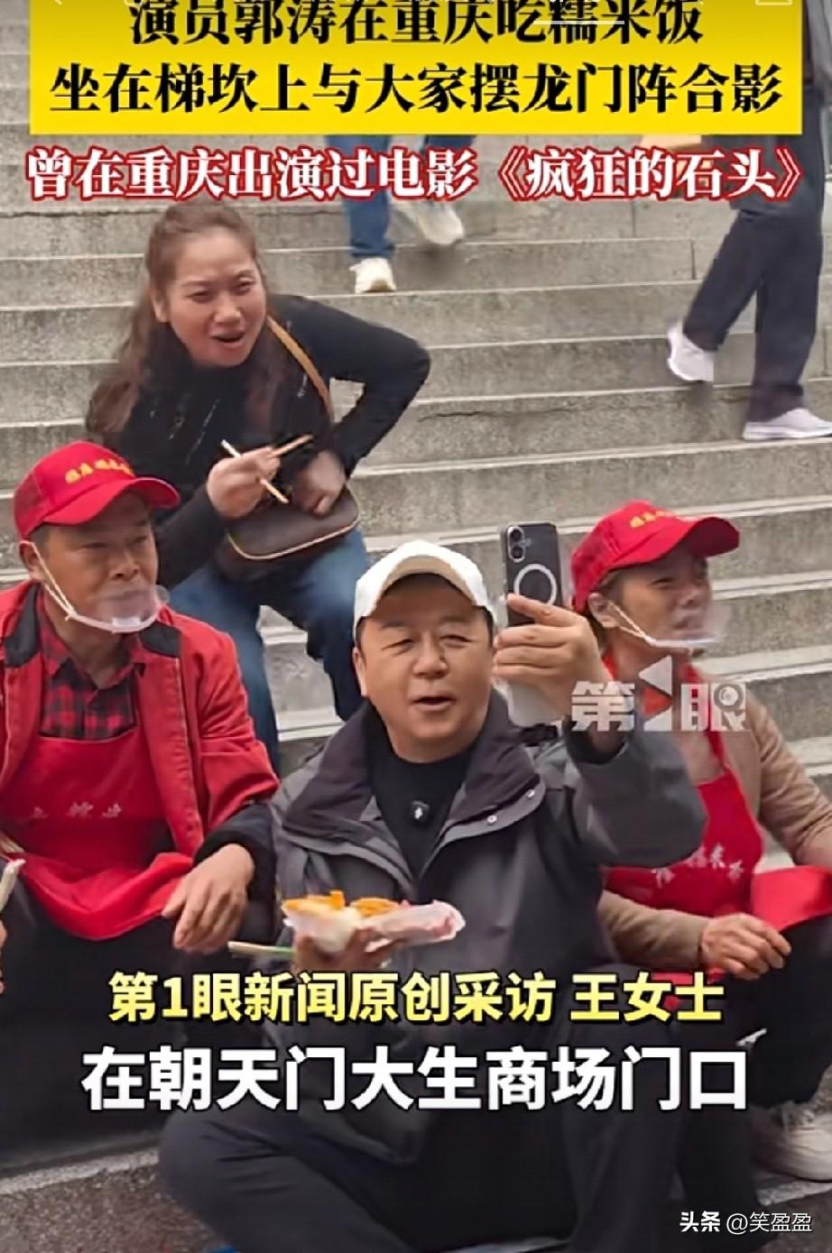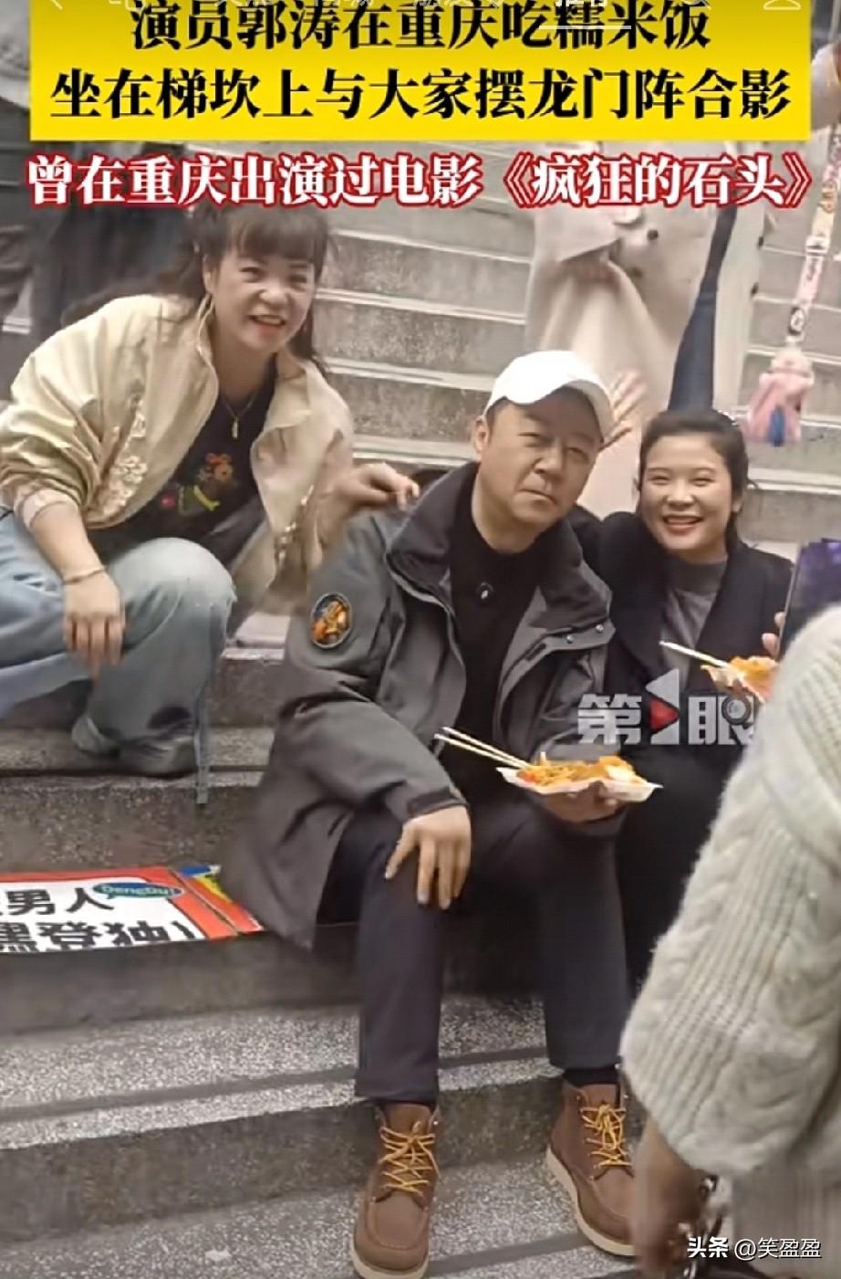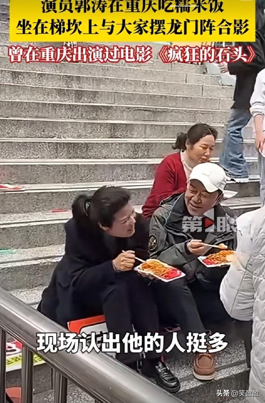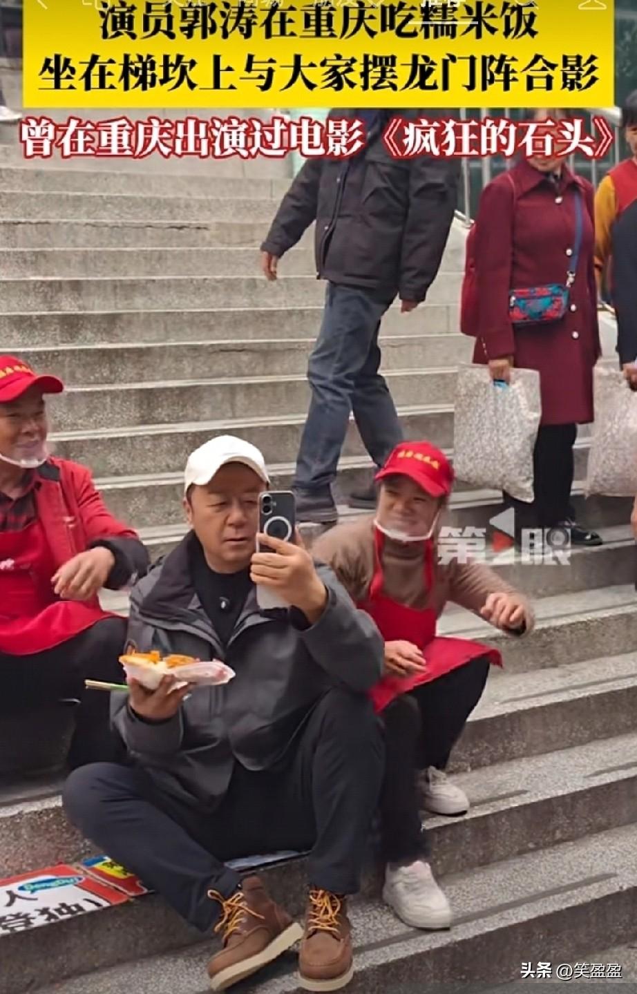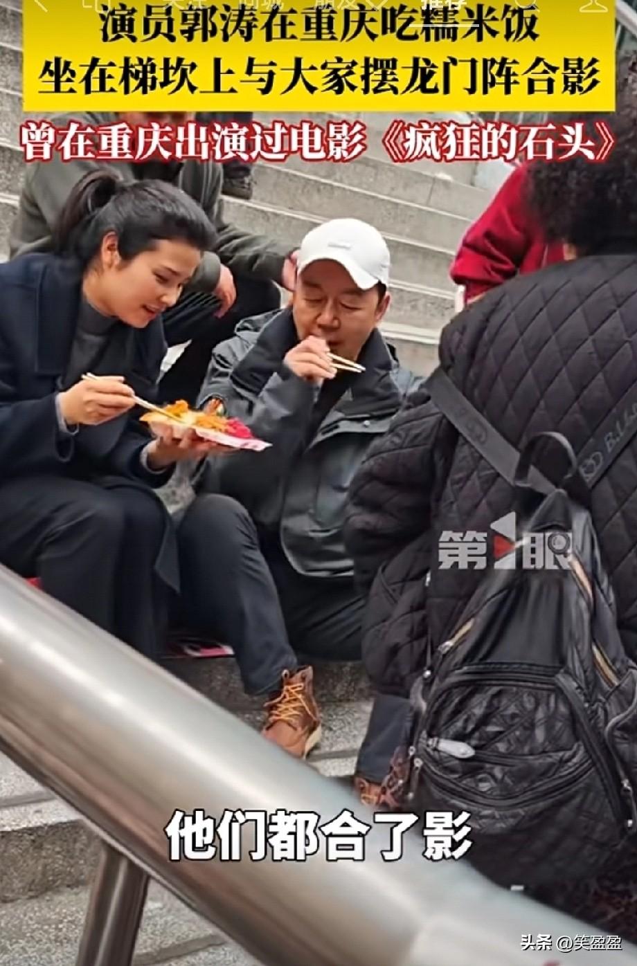 接地气!演员郭涛在重庆朝天门吃糯米饭,坐在梯坎上与大家摆龙门阵合影,曾参演过的电影《疯狂的石头》就在重庆取景。
