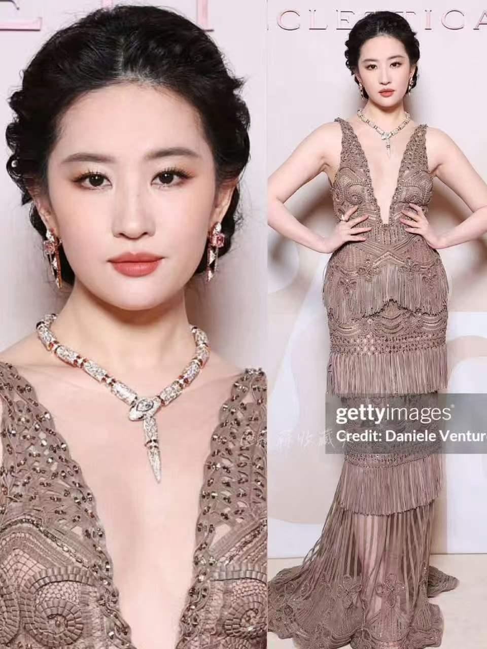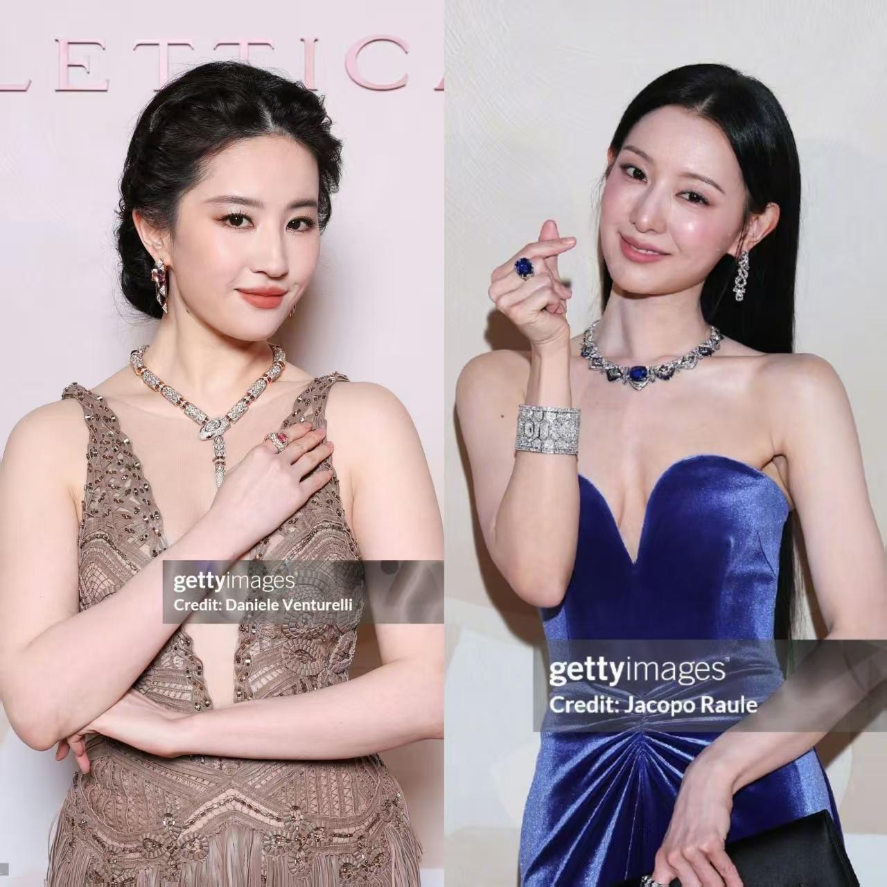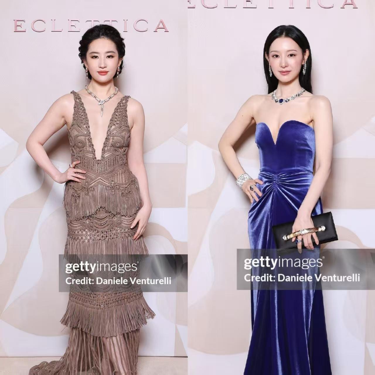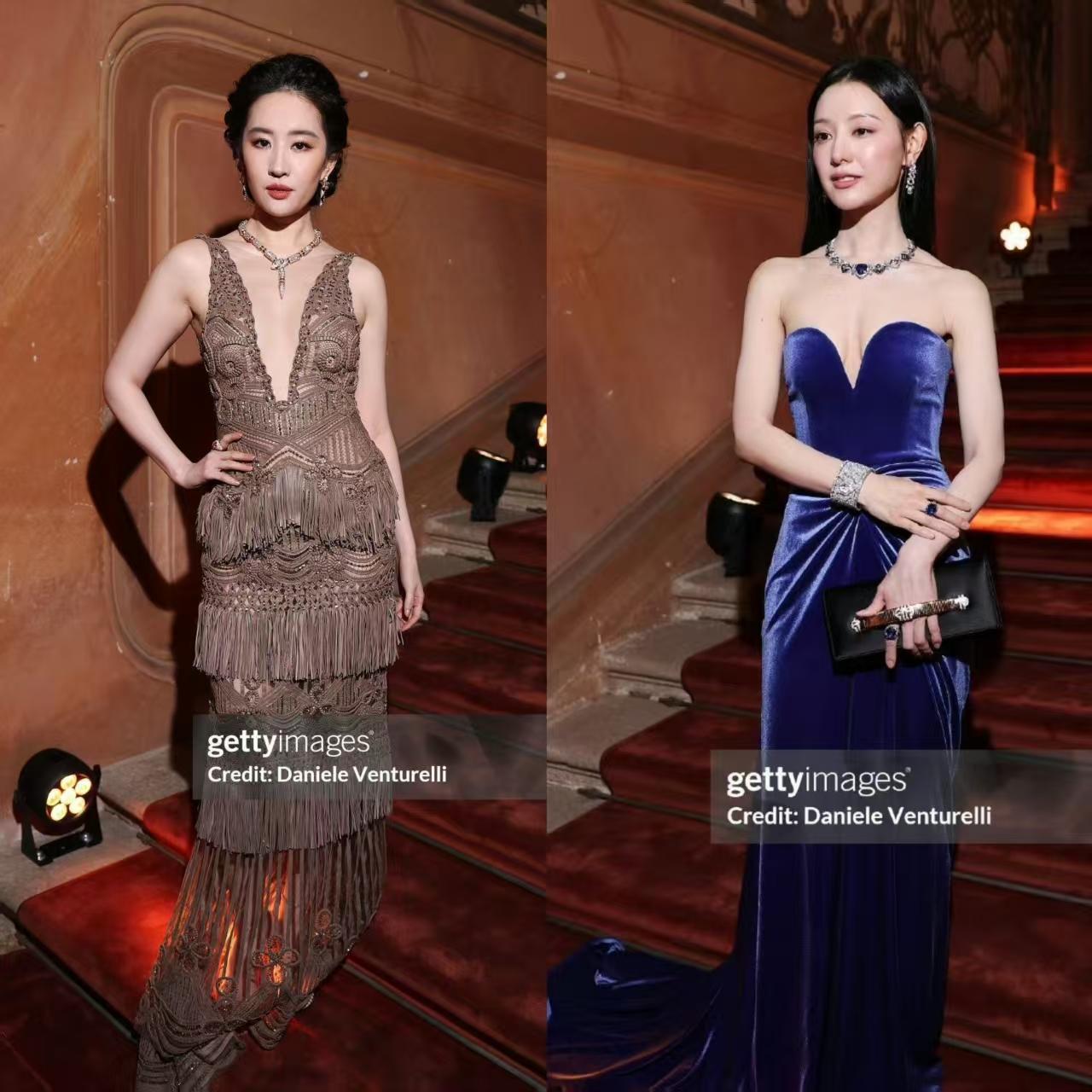 昨晚宝格丽米兰珠宝大秀。 左边是刘亦菲,右边是金智媛。 左边38岁身高170cm,右边33岁身高164cm。 左边咖啡色深V流苏长裙,右边宝蓝色丝绒抹胸长裙。 左边是内娱顶流,右边是kpop门面担当。 身材方面,刘亦菲微赢金智媛。颜值这块,俩人旗鼓相当。气质方面,刘亦菲略胜一筹。演技这块,个人觉得金智媛要好一些。 刘亦菲、金智媛两位宝格丽公主,谁状态更好?