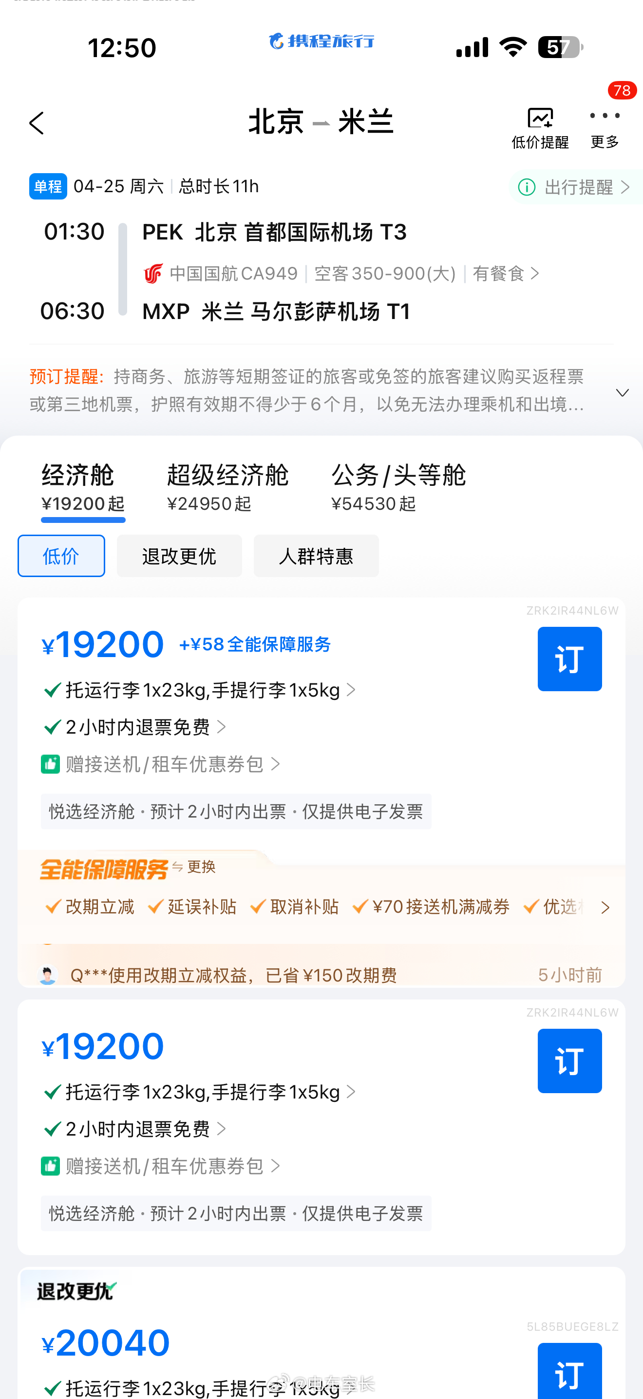 中东已经够乱了看下个月去欧洲机票北京直飞米兰19200,阿布扎比中转2700给你
