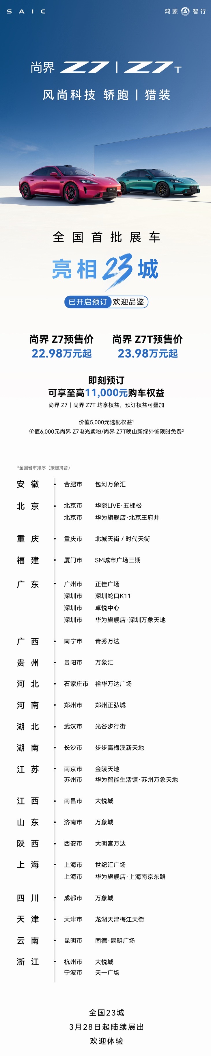 尚界Z7预售价格22.98万起 尚界Z7、尚界Z7T 全国首批展车将于3月28日