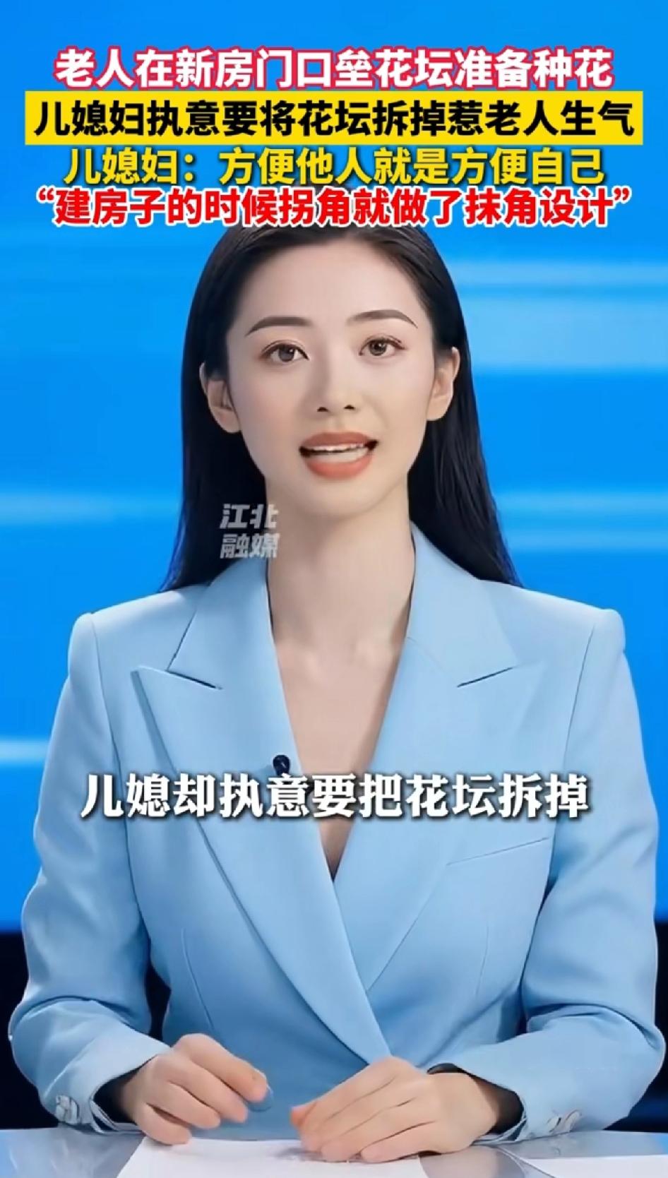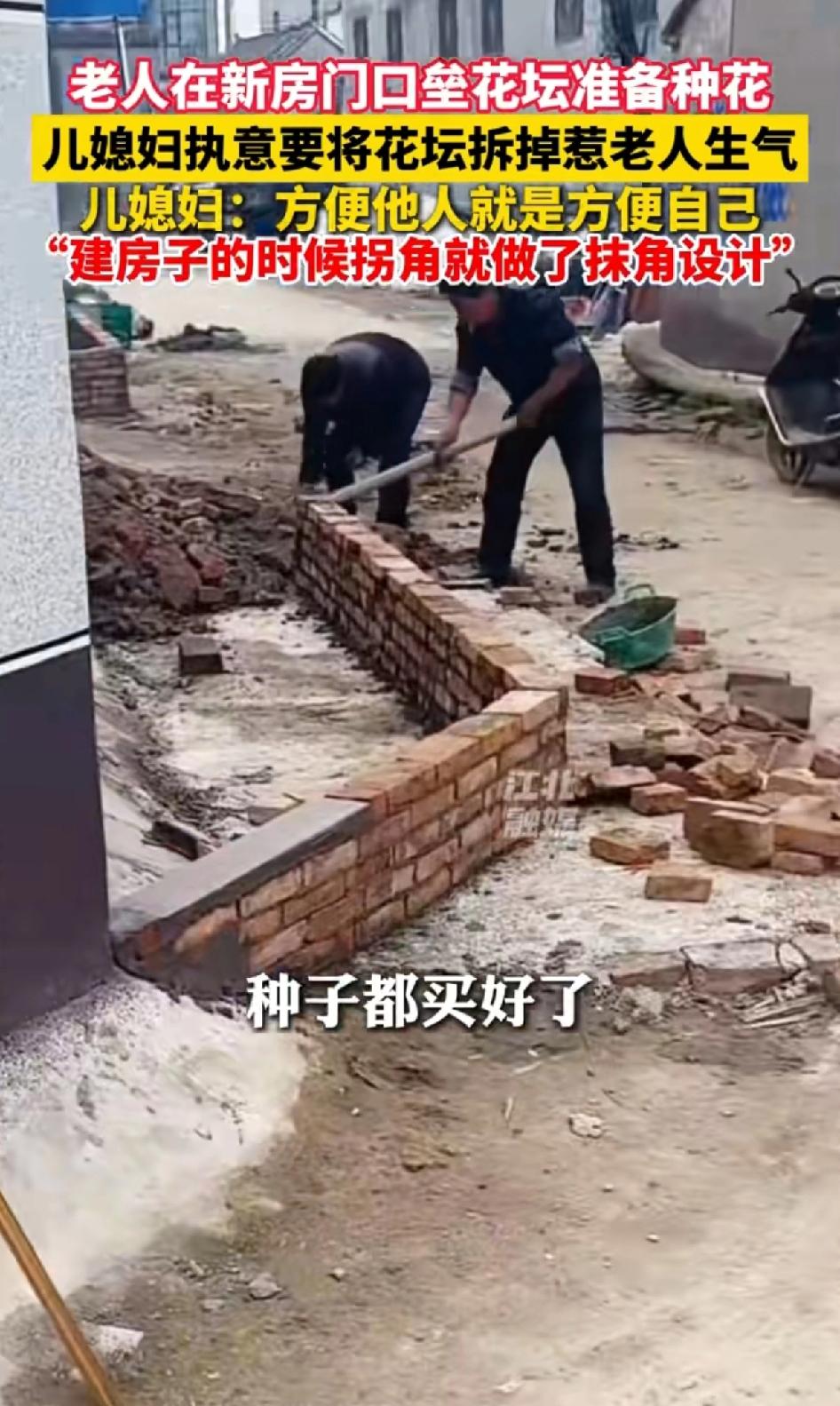 老人在新房门口垒个花坛准备种花,儿媳执意要将花坛拆掉惹老人生气。儿媳妇:方便他人就是方便自己。 儿媳妇:自家的房子正好赶到路口拐角处,建房时为了方便车辆拐弯已经在拐角处留了弧度做了抹角设计,现在公公再垒花坛她是觉得花坛会影响通行,所以决定拆除花坛。 公公婆婆把种子都买好了,就决定垒好花坛再种上蔬菜方便自家采用。 儿媳表示自己这样做公婆心里会有不舒服,但想到过往车辆因为有个花坛拐弯出行都不方便,所以强制拆除。 最后儿媳妇表示:方便他人就是方便自己。