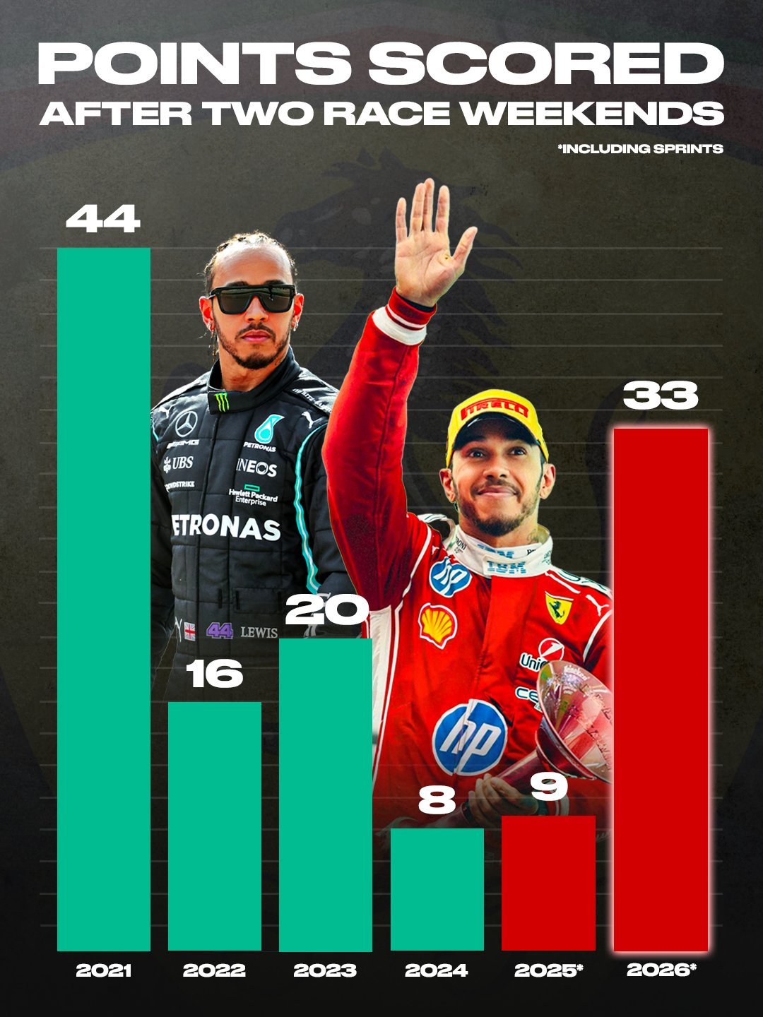 汉密尔顿开季两站33分,这是2021赛季以来开季两站过后积分最多的一年。