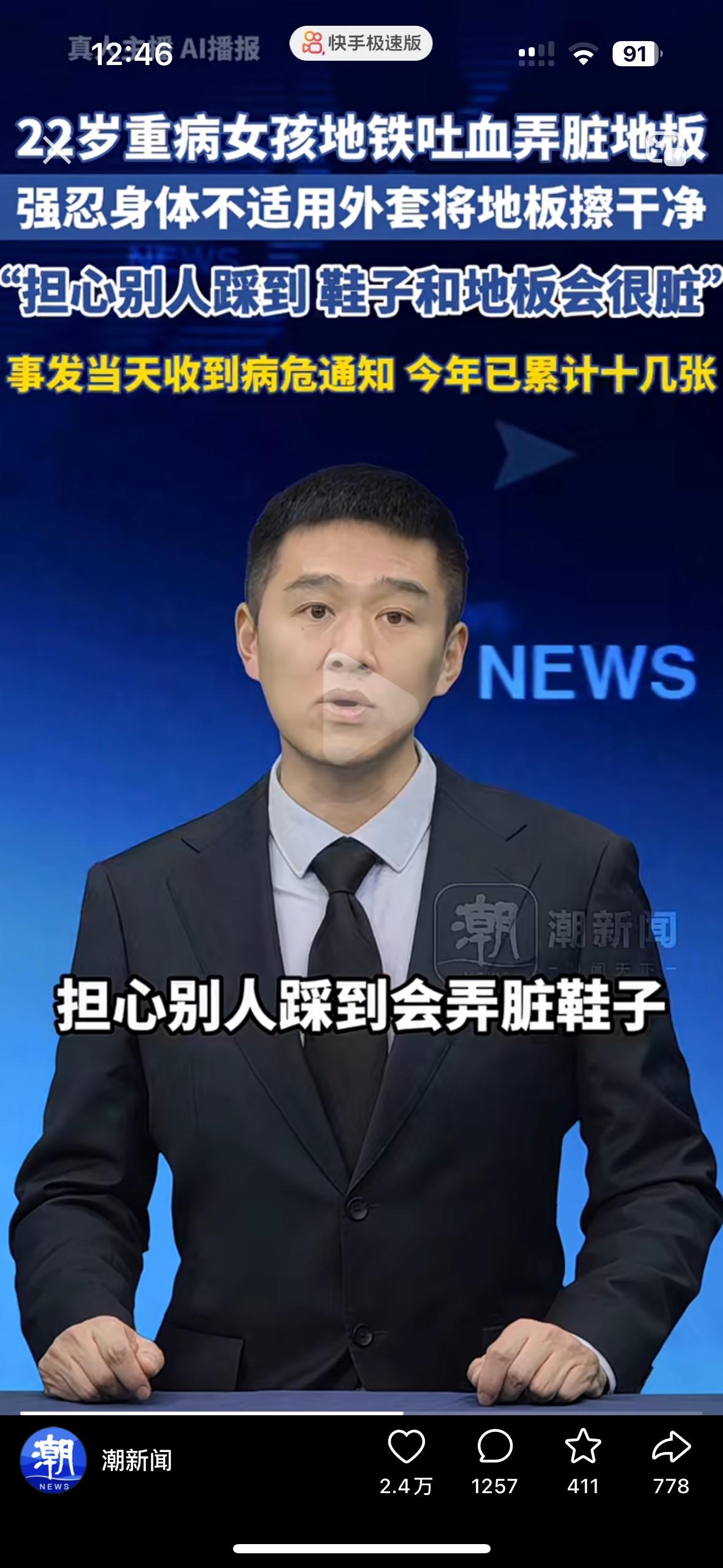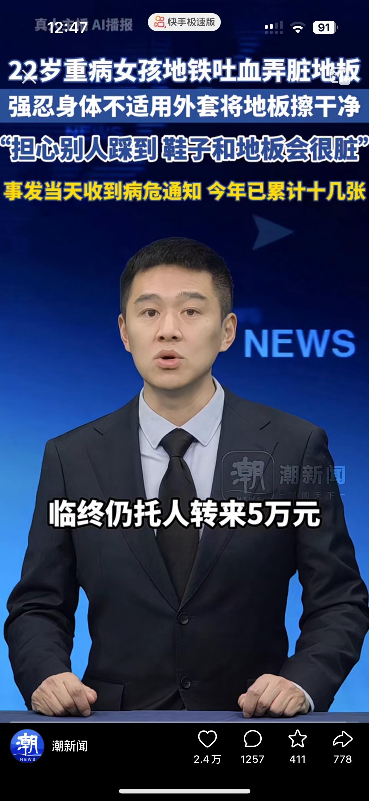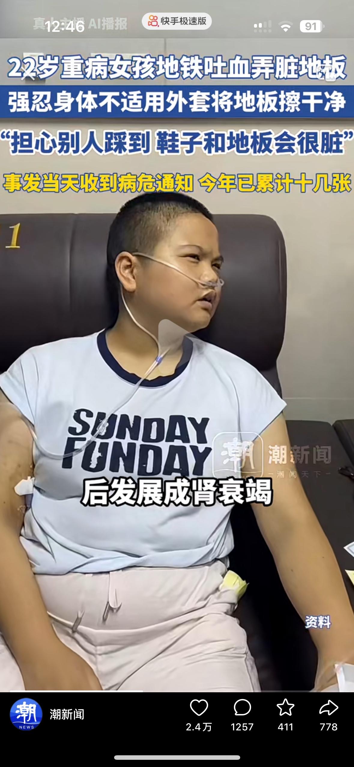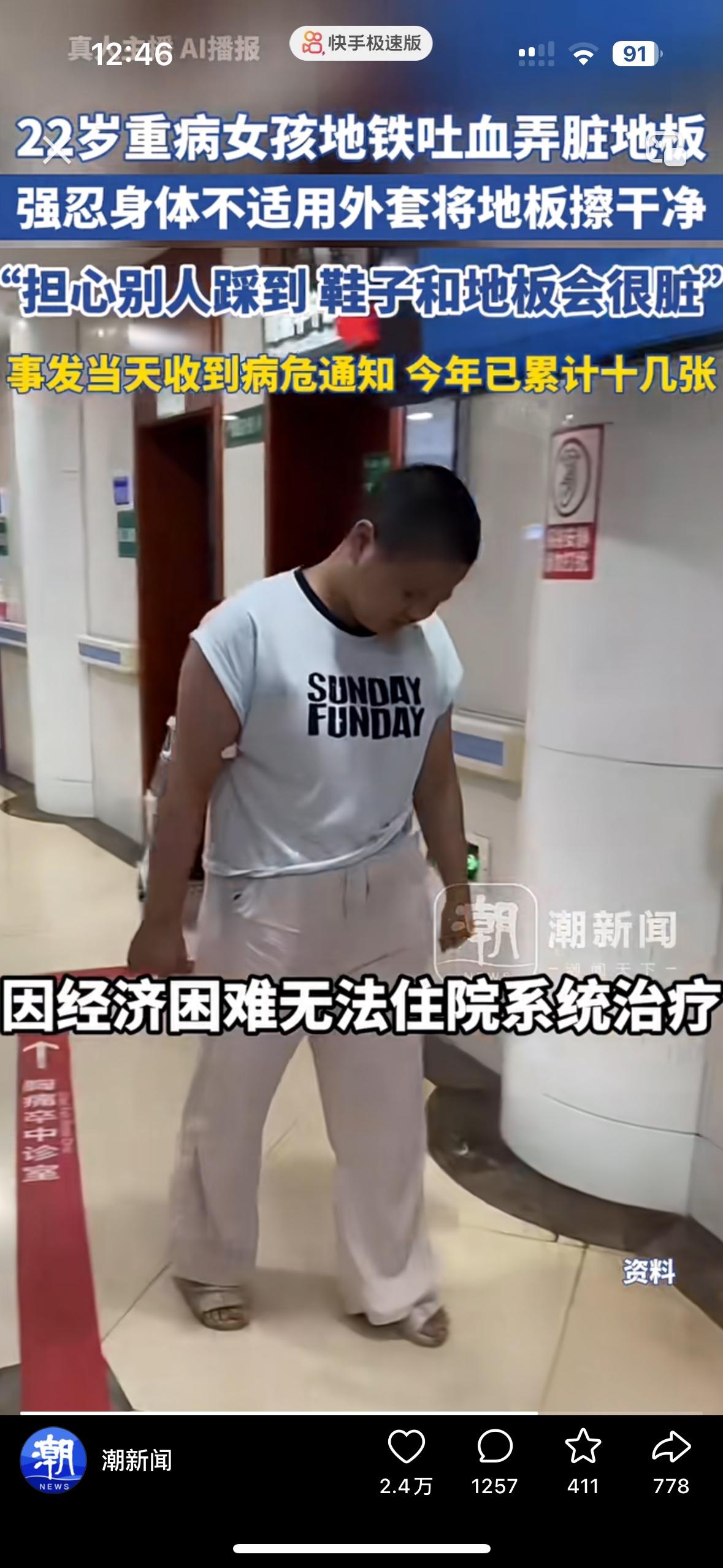 看哭了!22岁的女孩在地铁上吐血了,却拿着自己的外套跪地擦血 她说一上地铁就感觉要吐,因为消化道出血,她根本忍不住!吐了一地的血,可她怕别人踩脏鞋子,又拿着自己的外套跪在地上擦,擦一会就得休息一下再继续擦。 让人心疼的是,当天的她其实是拿到了病危通知书,今年已经收到了十几张,2018年确诊了罕见病,拖成了肾衰竭,没钱住院只能硬扛着。 男友曾经求婚2次都被她拒绝了,去年男友因病离世,临终前托人给她拿来了5万块钱,这么好的女孩真希望她能活下来!大家帮帮她吧!