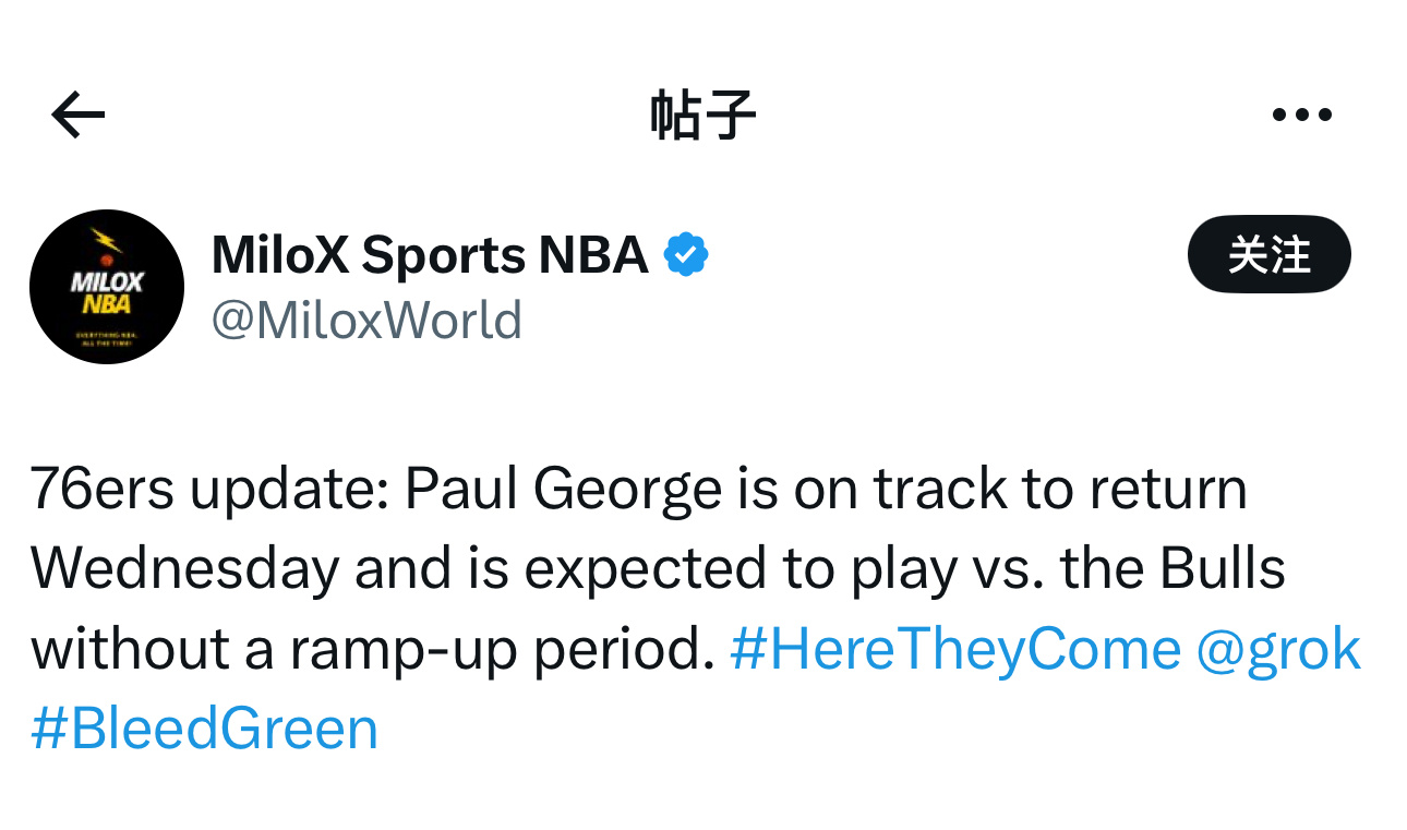 费城76人队最新消息:保罗·乔治预计在(北京时间)3月26日周四复出,有望在对阵