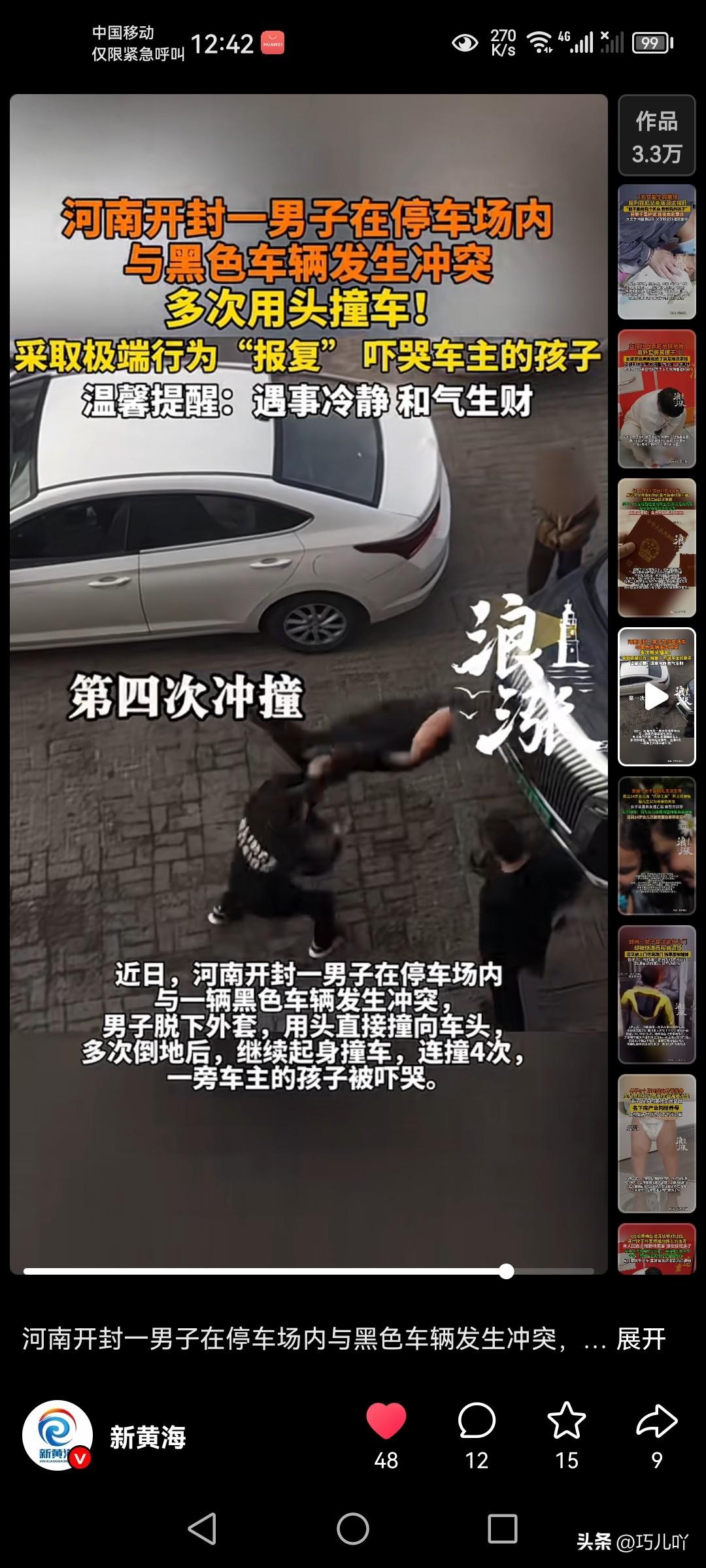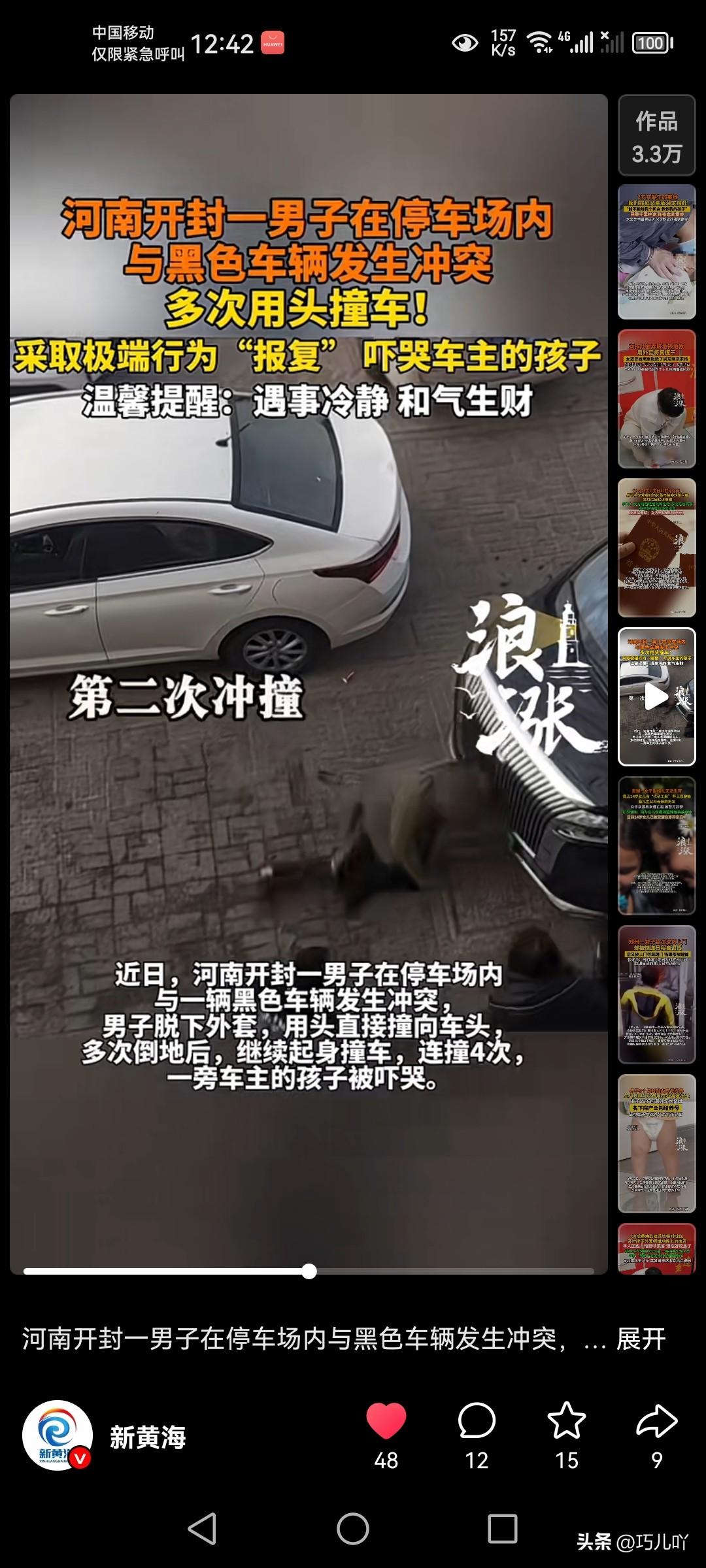 两车发生冲突,一司机竟然下车多次用头冲撞对方车子。世界上竟然有这样极端的人! 3月22日,在河南省开封市的一个停车场里,一辆白色小车与一辆黑色轿车因停车发生了冲突,进而导致双方司机争吵。 结果,让人没想到的是,白色司机气呼呼地从车上下来,直接用头朝着黑色轿车撞了过去。而且力度还非常大,隔着屏幕都感觉到疼! 估计黑车司机也没料到会遇到这种人,慌忙从车上下来后去拉拽白车司机。 可是,这个白车司机就像发了疯一样,仍旧固执的用头继续撞车。 车里还坐着一个五六岁的男孩儿,看到这样的场景,把他吓得哇哇大哭起来。 实在让人无法理解,一个小小的纠纷,竟然要采用这种极端方式来处理。 遇事冷静,和气生财,难道把人家的车撞了就不需要赔钱吗? (信息来源:新黄海)