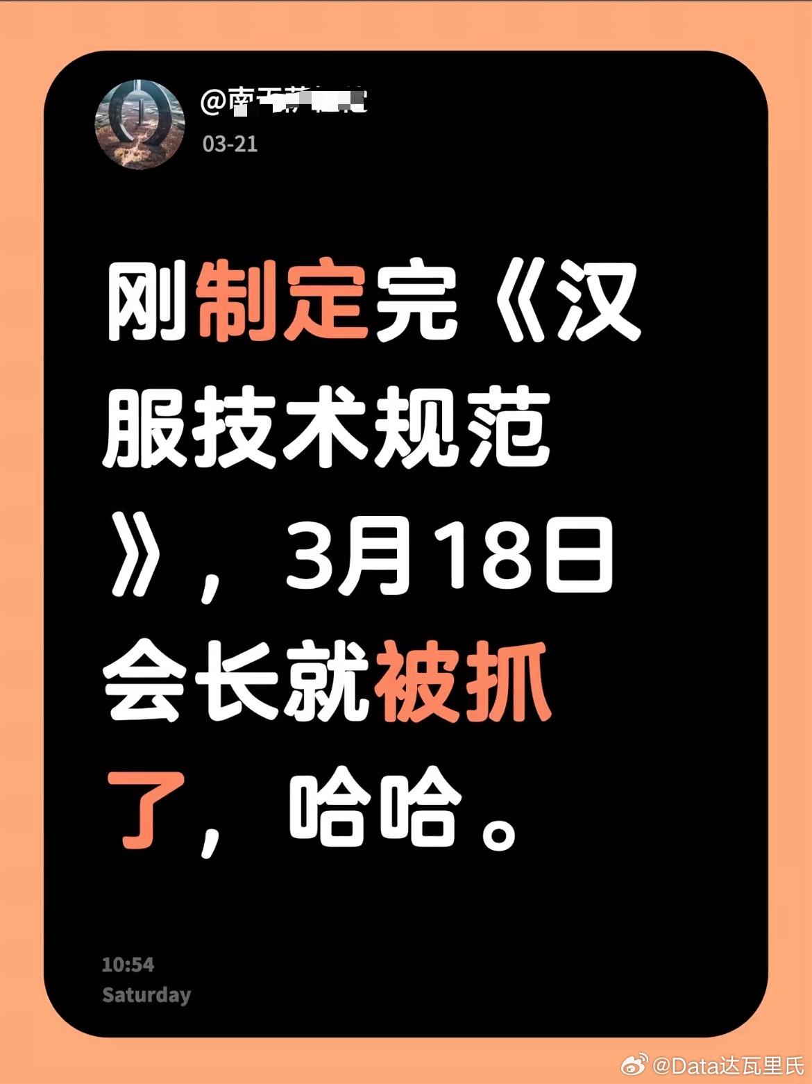 说要给汉服制定标准的人没多久就被抓了,哈哈哈哈……汉服那么多朝代,啥样就啥样制定个鬼的标准,只要别以满代汉,用“唐装”和“新中式”忽悠老百姓就行