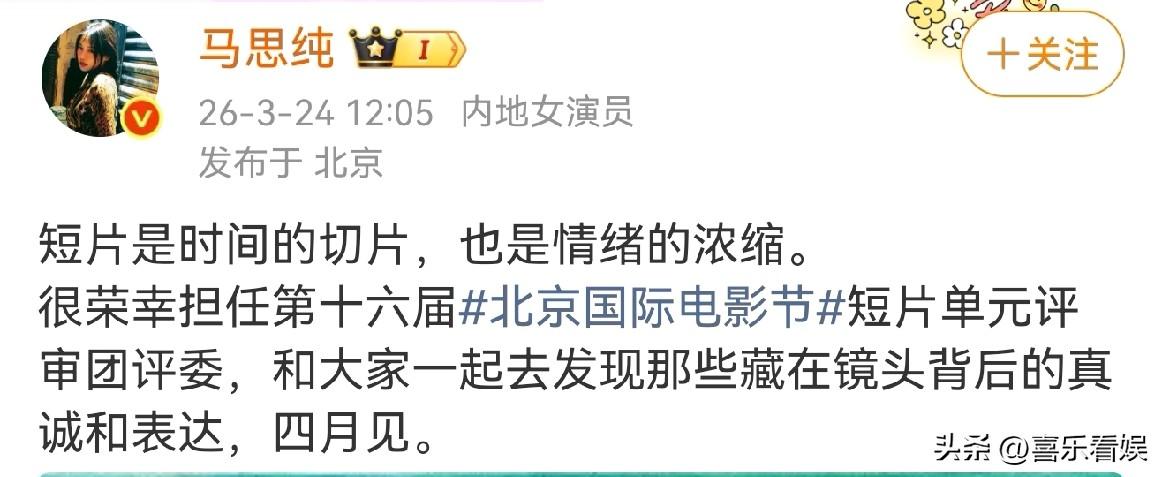 马思纯,高调官宣! 3月24日,马思纯突然官宣了个新身份,引得粉丝网友们都一致的期待,原来她要当第十六届北京国际电影节短片单元的评委啦 马思纯自己发微博说,短片是“时间的切片,也是情绪的浓缩”,还说很荣幸能和大家一起发现镜头背后的真诚与表达,约着四月见。 她还配了张海报,画面里她穿了件干净的白衬衫,黑卷发飘着,笑起来温温柔柔的,整个人都透着股知性又松弛的劲儿。 说起来,马思纯这些年一直在慢慢沉淀,从《七月与安生》里的影后,到后来慢慢减少曝光,专注生活和作品,这次跨界当评委,还挺让人意外的。 马思纯是1995年凭借参演电影《三个人的冬天》亮相演艺圈的,这一年她才7岁,也算是童星出身。 不过,马思纯正真走入观众视线的,是2015年之后了。她出演了《左耳》《他来了,请闭眼》《七月与安生》《你是我的城池营垒》等多部作品。 以前总觉得马思纯是那种会把情绪揉进角色里的演员,现在要以评委的眼光去看别人的作品,想想还挺期待的。 毕竟她自己演过那么多细腻的角色,肯定能精准get到短片里那些藏着的小心思。 从拿奖的演员,到现在给新人作品把关的评委,马思纯这一步走得稳又踏实,或许这才是演员最好的状态吧,不慌不忙,在自己的节奏里慢慢发光。