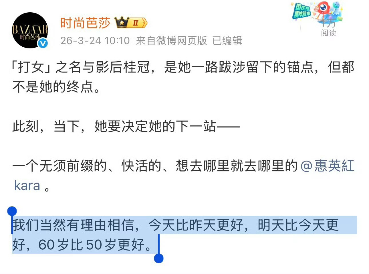 惠英红二登时尚芭莎封面“听人讲60岁是人生的18:30。 我想,那我六十六岁了,正是晚上最热闹的时候”永远为红姐的气质和格局心动!