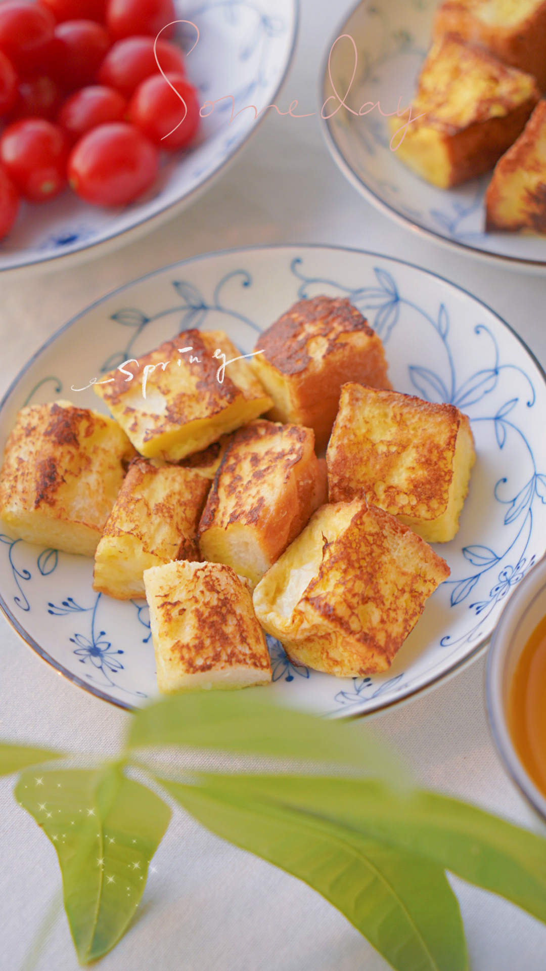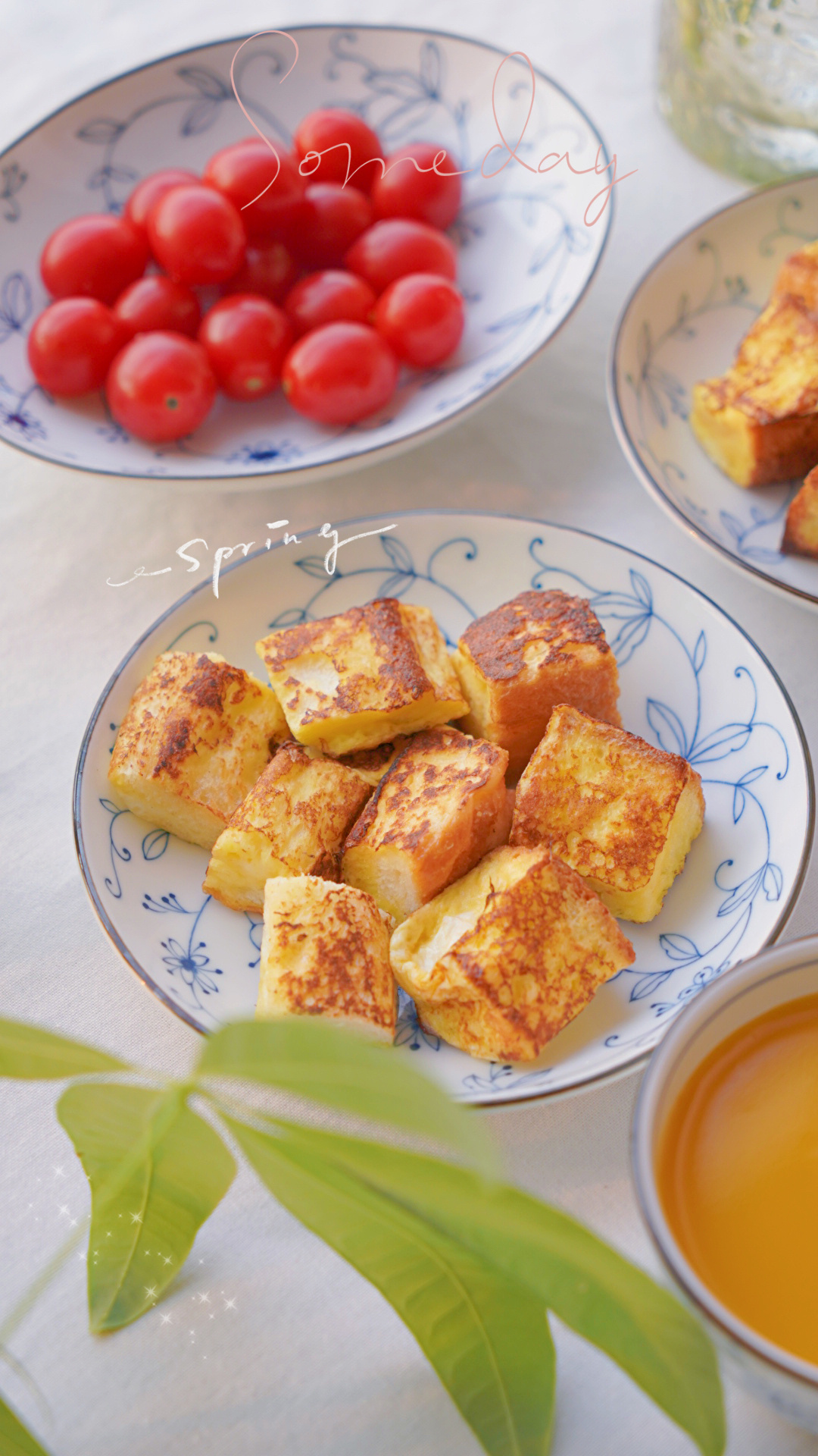 今日早餐,吐司西多士牛奶鸡蛋混合沾吐司块,然后平底锅煎一下很好吃!