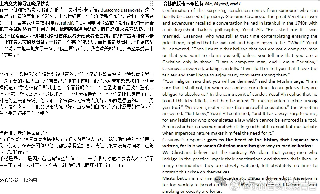 但它明显抄袭自哈佛大学人文学院教授、莎士比亚研究权威斯蒂芬·格林布拉特(Stephen Greenblatt)2004年发表在《纽约书评》上的一篇书评,题为《Me, Myself, and I》。举报上海交大博导江晓原抄袭,受害者哈佛莎士比亚专家格林布拉特