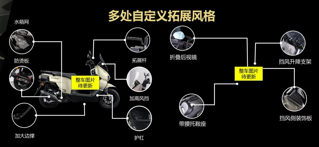 如果你觉得自己的可以更酷,那么原厂的改装配件还挺多,什么加高风挡、护杠、拓展杆、防烫板、水箱网、折叠后视镜等等相当丰富,这点确实很贴合大众的心理,毕竟125车型的用户基数确实大,改装的需求自然也大。这五羊本田不得不说考虑得挺周到。