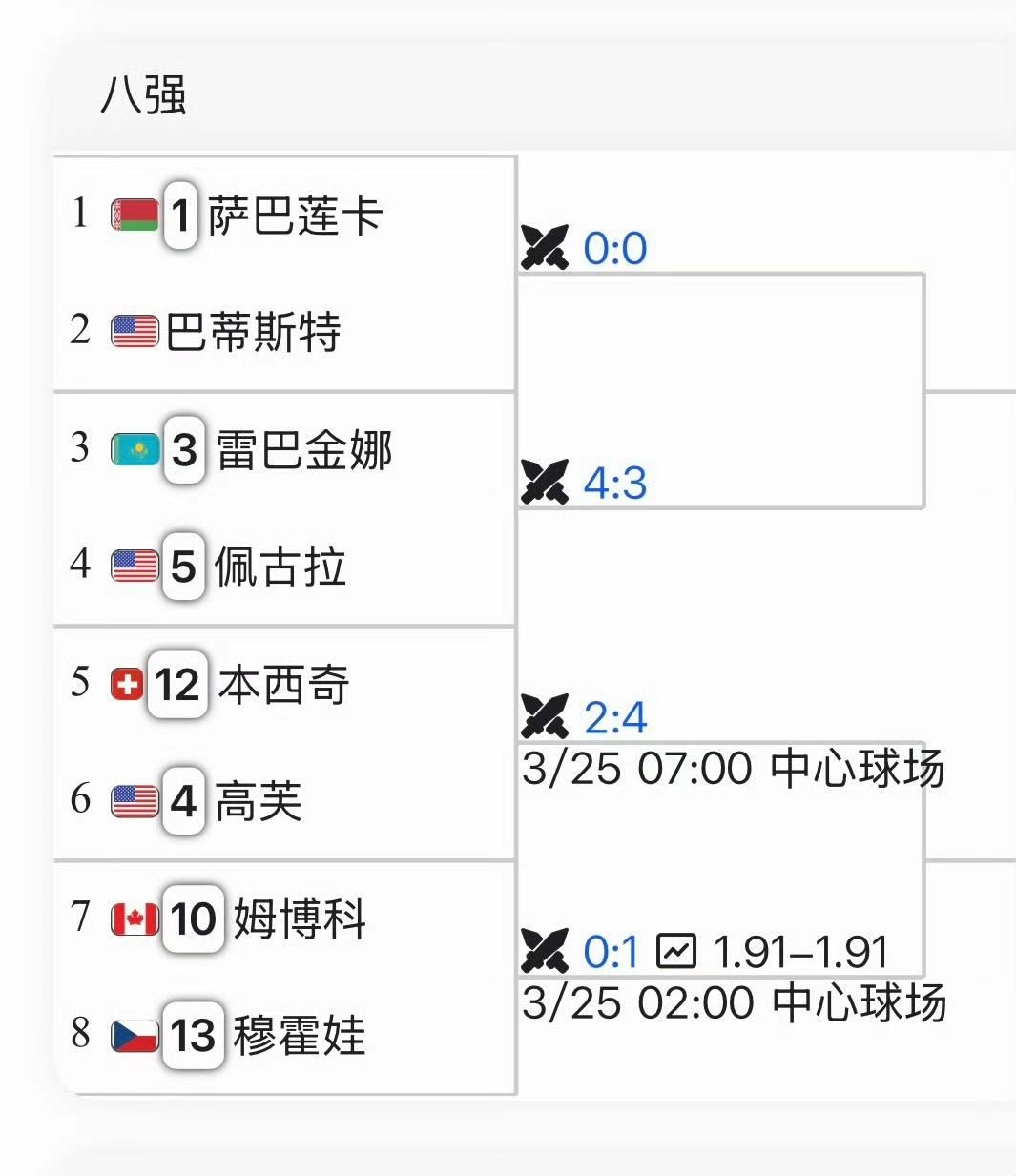 本西奇6-2/6-2完胜6号种子阿尼西莫娃,赢下今年的第三场TOP10胜利,时隔三年再进赛会八强。 本西奇可谓逆袭天花板,去年从排名487位一路狂飙回世界前十,2025首进温网四强,联合杯单打MVP、跨赛季11场连胜,妈妈级选手状态一路封神。