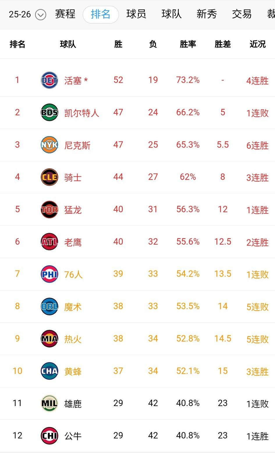 西部排名又乱了!火箭爆冷不敌公牛,排名跌至第六,掘金森林狼躺升排名。湖人憾负活塞排名依然第三。 8-10名全都赢球,排名维持不变。 热火输给马刺后来到5连败,排名暂居第9,随时会被黄蜂反超。 不过东部差距不大,5-10名仅相差3个胜场,随时都可能掉队。