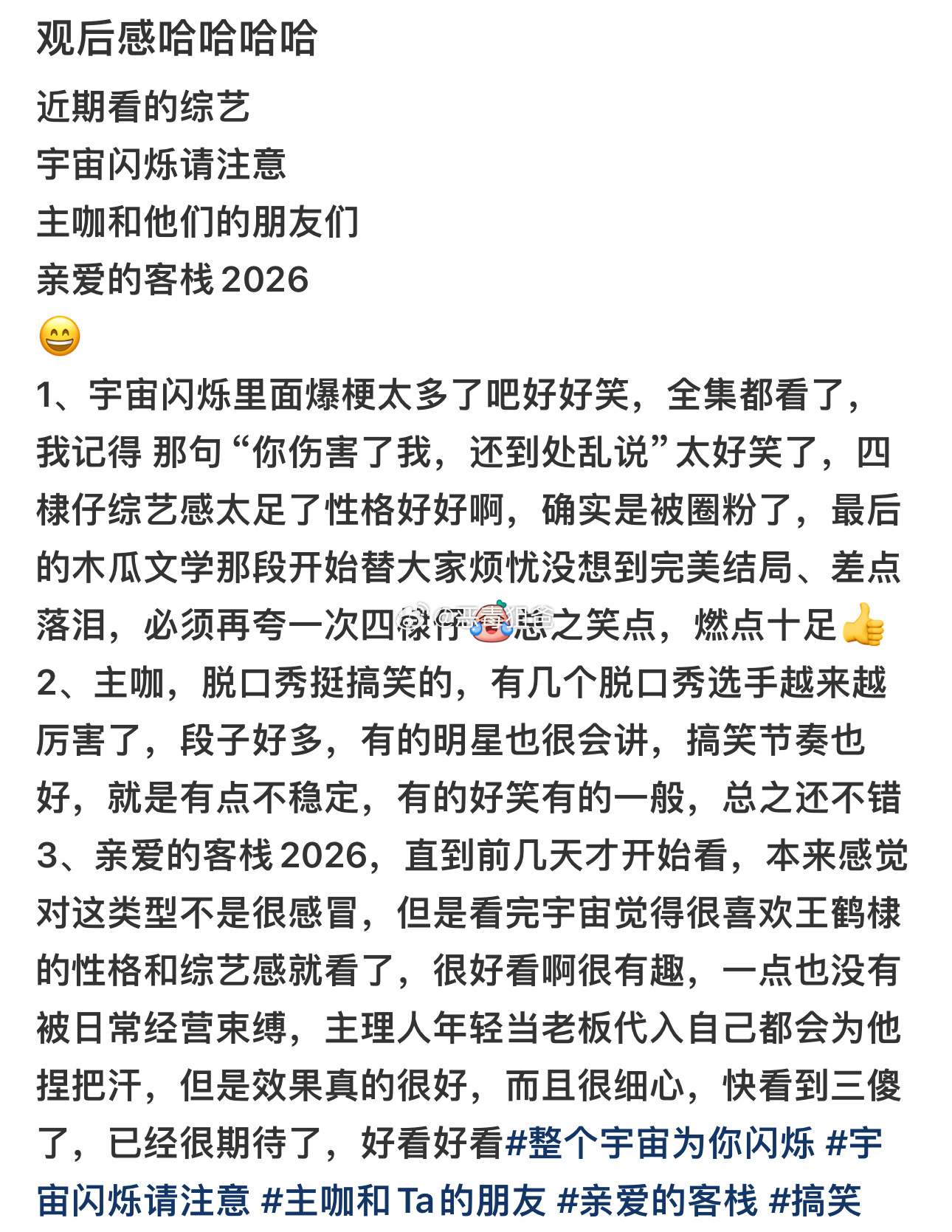 最近在🍠又刷到好多看了宇宙闪烁和亲爱的客栈入坑王鹤棣的 不仅王鹤棣的剧是有效播剧就连综艺也是有效综艺啊