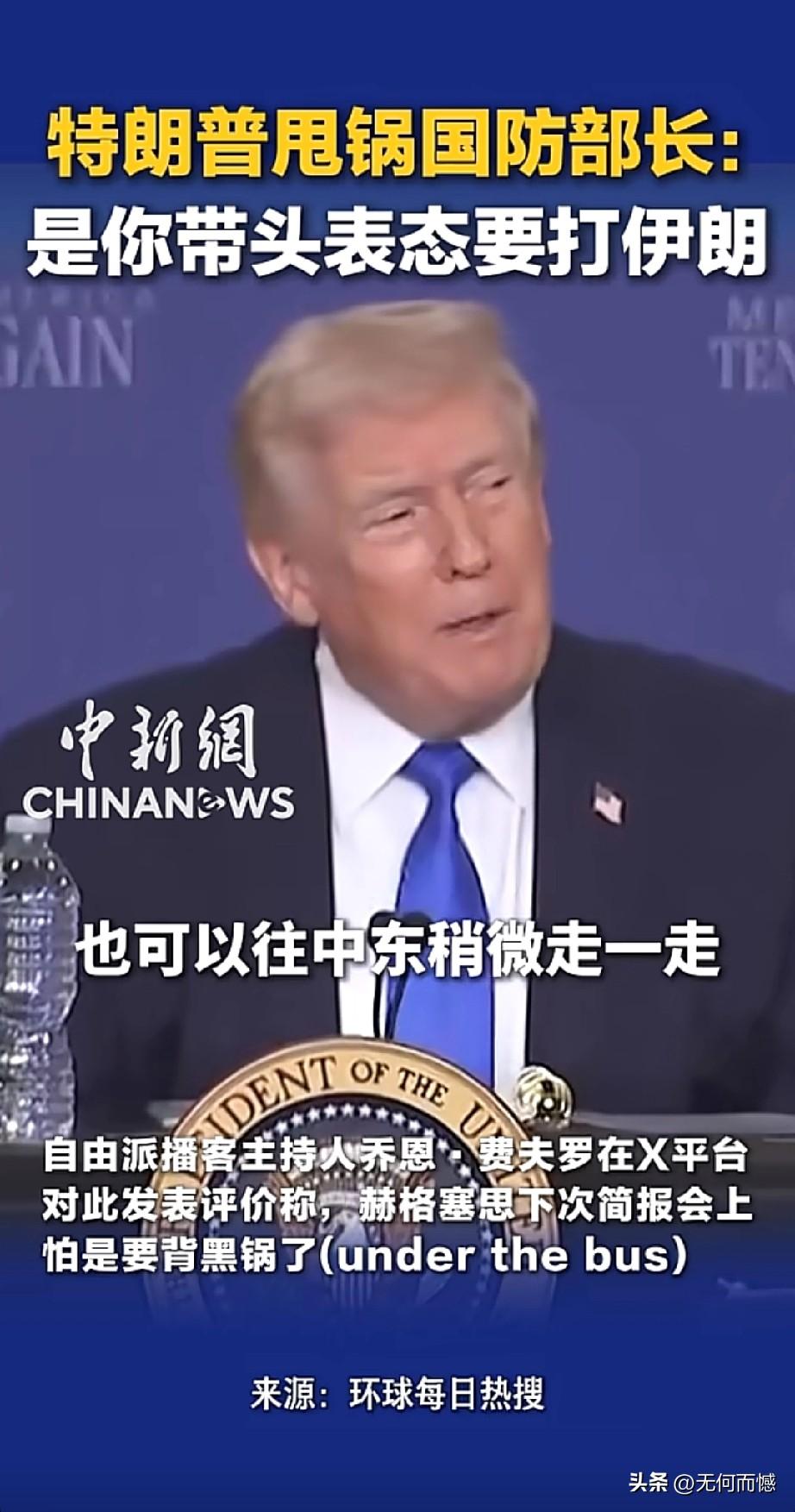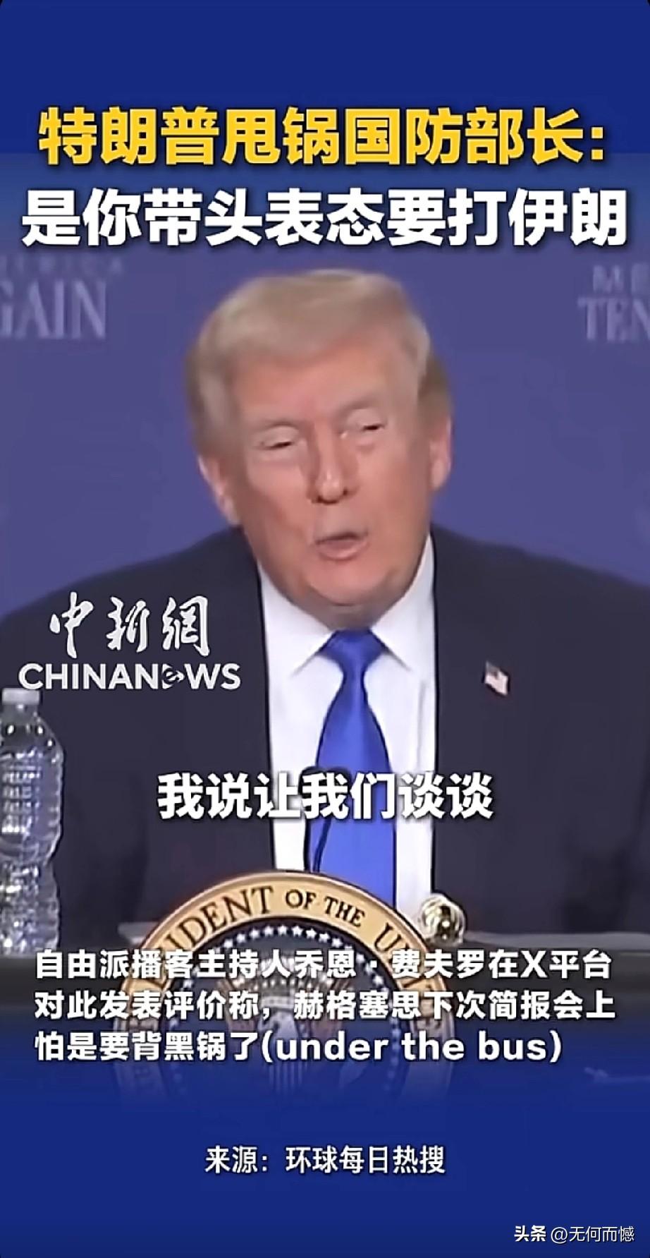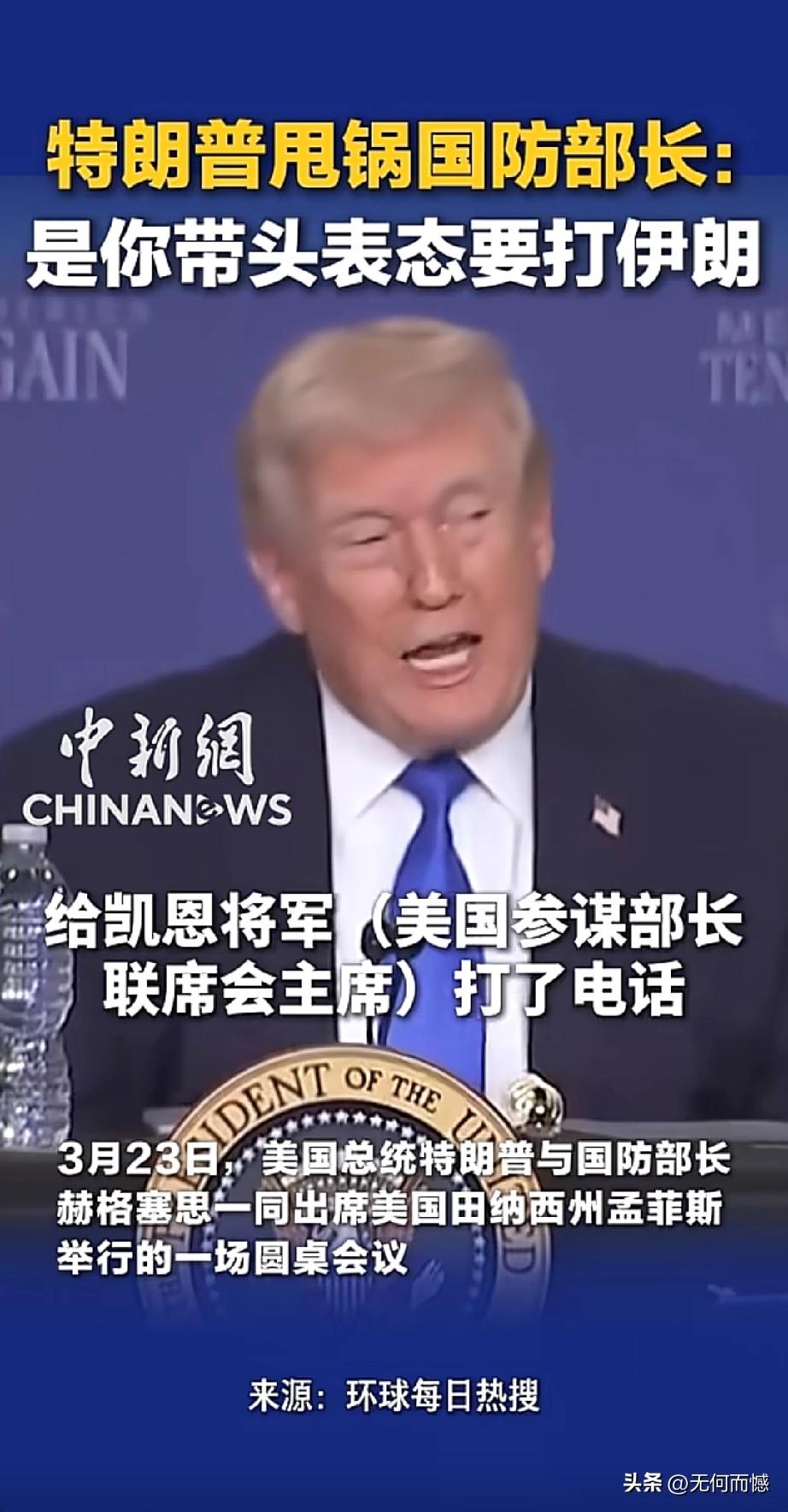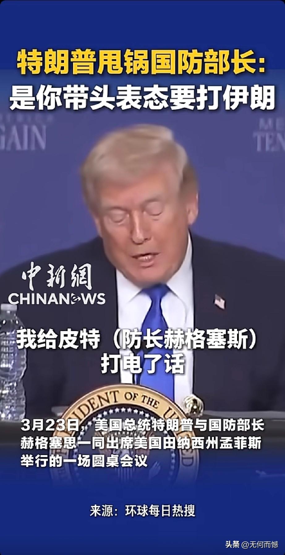 老特当众“甩锅”国防部长,打伊朗这锅我不背!3月23日,田纳西州孟菲斯的一场圆桌会议上,老特当着国防部长赫格塞斯的面,把“对伊朗动武”的锅甩得明明白白。他翻起旧账,细数自己当时给参联会主席凯恩将军、防长皮特(赫格塞斯)等一众高官打电话商议对策,强调自己本想“谈谈解决问题”,结果是赫格塞斯第一个跳出来拍板“干吧”,还放话绝不能让伊朗拥核。这波操作看得网友直呼内行,自由派播客主持人乔恩更是一针见血:赫格塞斯下次简报会怕是要被“扔到车底”,妥妥要背这个黑锅了。毕竟,老特的经典套路就是:功劳归我,锅归你,中东这摊子烂事,谁先出头谁倒霉。