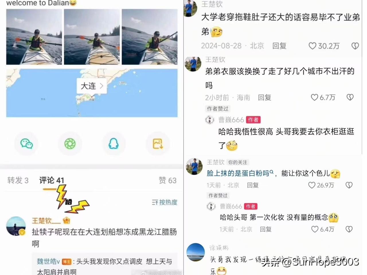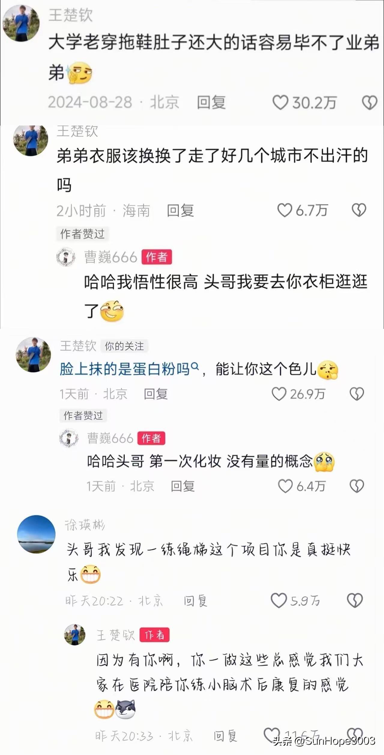 王楚钦出口就是梗,真的要被他笑死了, 毒舌又幽默,和他做朋友一定不会寂寞的😁 这里哪一句话都是笑点, 标点符号不喜欢用,有标点的时候很少, 所以,网友经常说“你看,气的头哥都带标点符号了” 读头哥的评论,你得自己会短句才行。 十句有八句带梗,还有东北人的幽默, 和他在一起得非常欢乐, 智商和情商都非常高。