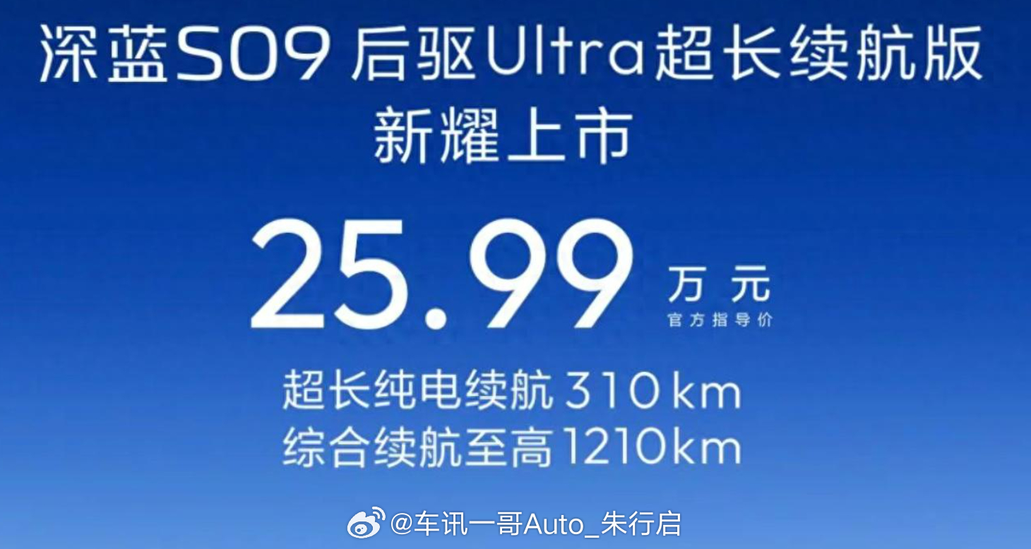 深蓝S09后驱Ultra超长续航版上市,25.99万起。作为新增车型,新车搭载容量为53.49千瓦时的电池,CLTC纯电续航里程310公里,CLTC综合续航里程1210公里。