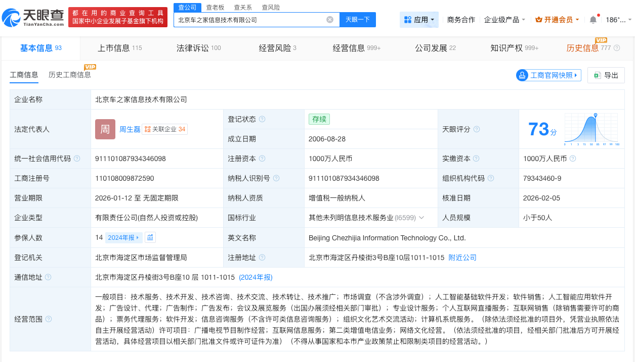 天眼查App显示,汽车之家关联公司北京车之家信息技术有限公司成立于2006年8月,法定代表人为周生磊,注册资本1000万人民币,经营范围包括个人互联网直播服务、互联网销售等。股东信息显示,该公司由周生磊、方兴共同持股。司法案件信息显示,该公司涉多起著作权权属、侵权纠纷,侵害作品信息网络传播权纠纷等,案件身份多为被告。