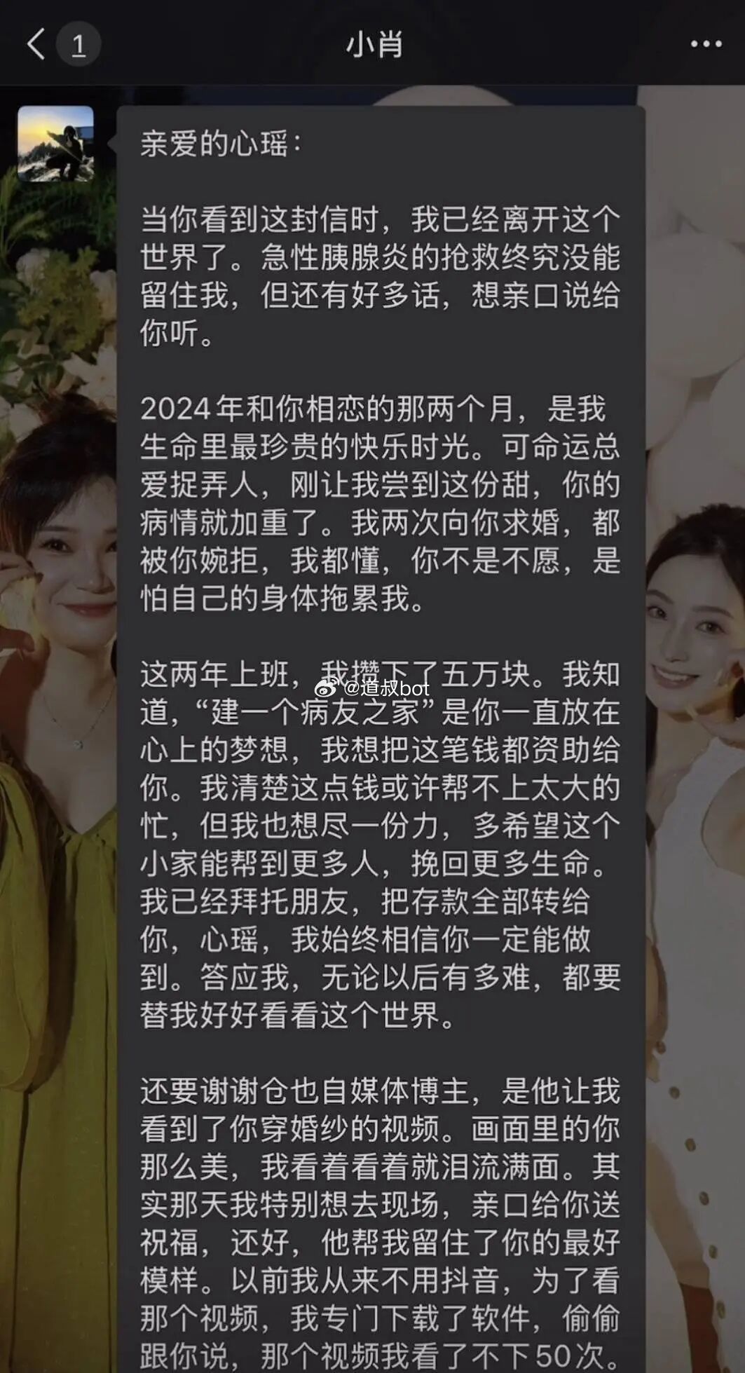 此前报道,绝症女孩心瑶的前男友因病离世,留给她全部存款5万元和一封遗书,两次求婚都被拒怕拖累,前男友以好心人的身份捐赠给她近8万元!