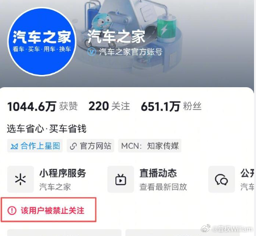 刚看到消息,汽车之家微博、抖音、B站全被禁关注了