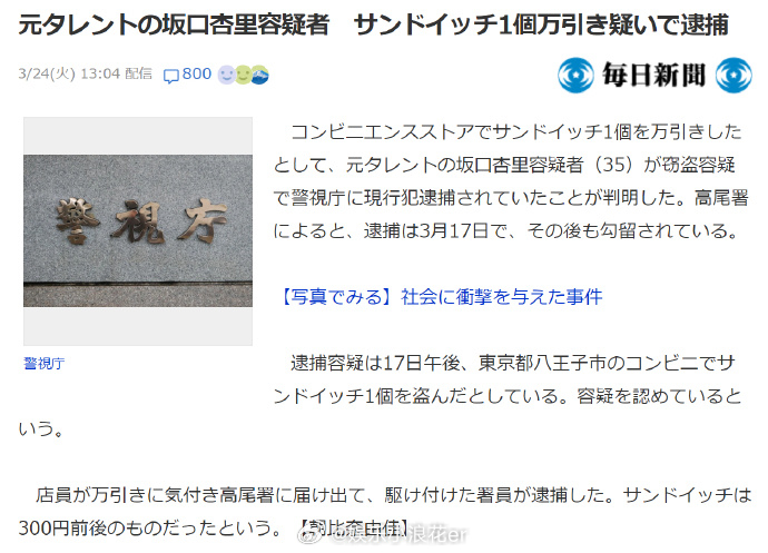 坂口杏里便利店偷三明治被逮捕日本艺人便利店偷三明治被逮捕 前星二代、演员坂口杏里(35岁)因在便利店偷窃一份三明治(300日元)被逮捕↓