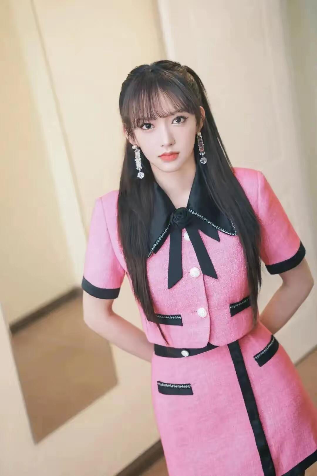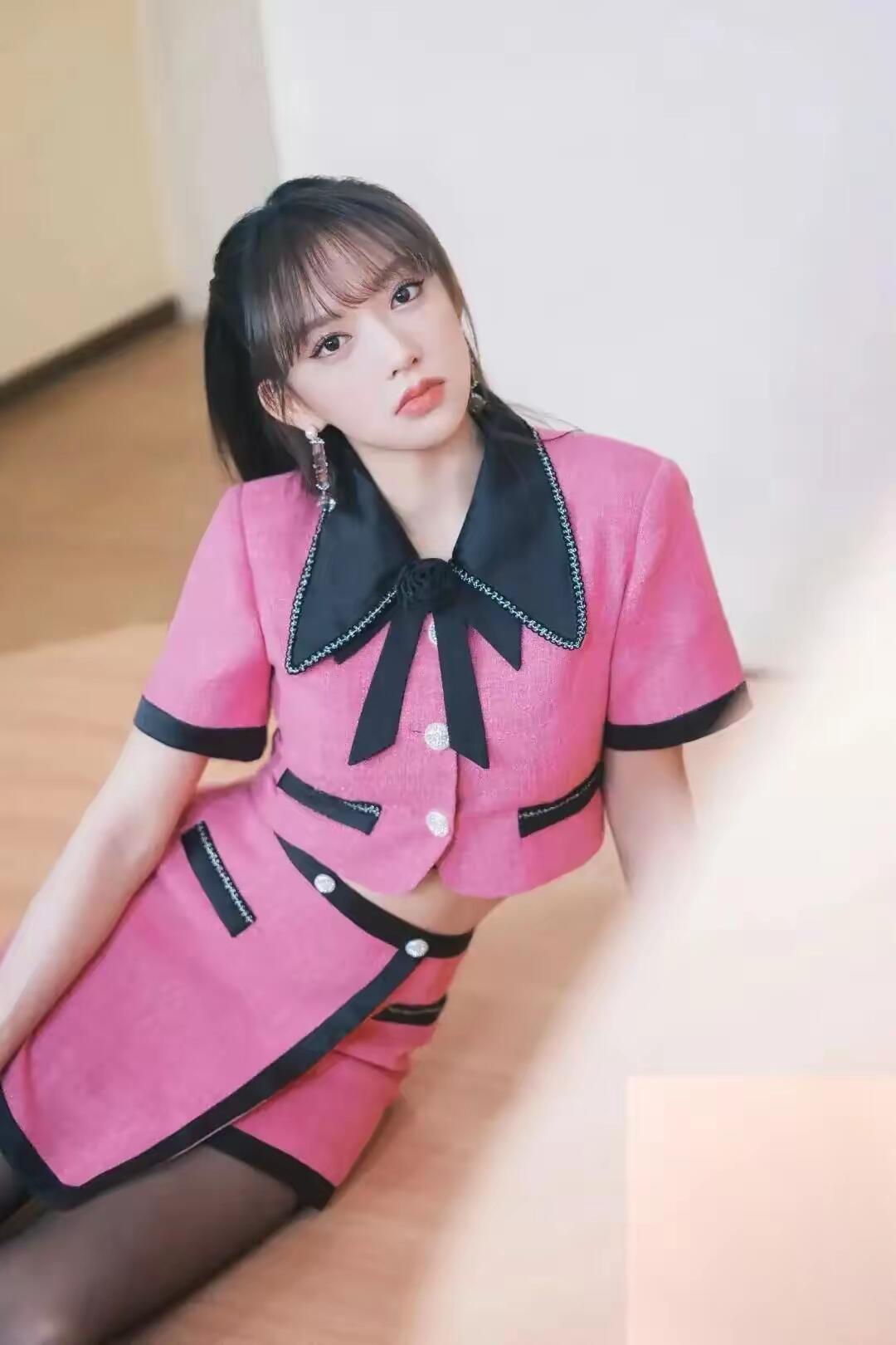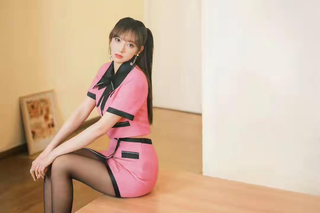 程潇粉色短裙配黑丝,又纯又欲,太美了