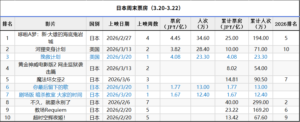 日本周末票房(3.20-3.22):1.《哆啦A梦:新·大雄的海底鬼岩城》四连冠,累计票房冲破25亿日元;2.《挽救计划》开画表现不错;3.《河狸变身计划》相比公映首周逆跌,累计票房破10亿日元。(数据来源:kogyotsushin、dorama)