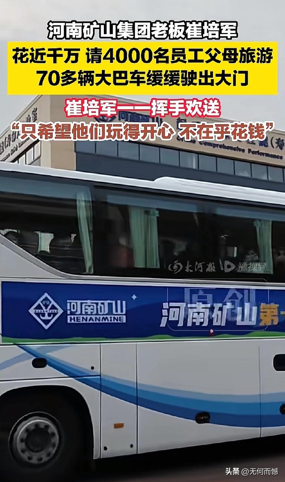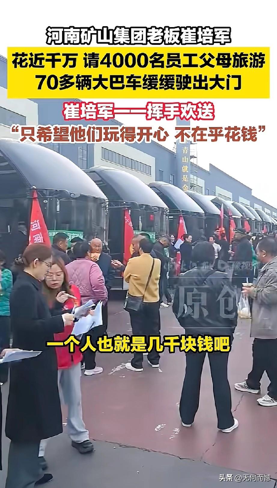 崔培军花千万请员工父母旅游!3月24日,河南长垣的河南矿山集团格外热闹,老板崔培军自掏腰包近千万,组织4000名员工父母踏上旅游行程,70多辆大巴车缓缓驶出公司大门。面对镜头,崔培军笑着挥手送别,坦言“只希望他们玩得开心,不在乎花钱”。他说,每位老人的旅游费用也就几千块,能让员工的父母感受到温暖与尊重,比什么都重要。这场别开生面的“孝心游”,不仅让老人们收获了快乐,更让员工们感受到企业的温度。实实在在说,这样有情怀的老板,值得所有人敬佩!