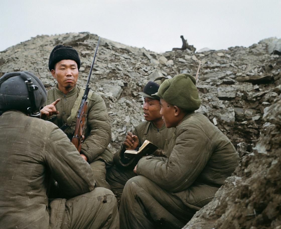朝鲜上甘岭的碎石阵地上,志愿军狙击手黄兴海正给战友们传狙击经。 他是“冷枪英雄”张桃芳的同班战友,在张桃芳的悉心指导下,毙伤敌军百名以上,成了令敌人闻风丧胆的狙击好手。 战友们围坐倾听,有人攥着笔记本认真记录,这朴素的分享,正是志愿军“以老带新、互帮互学”的生动注脚。