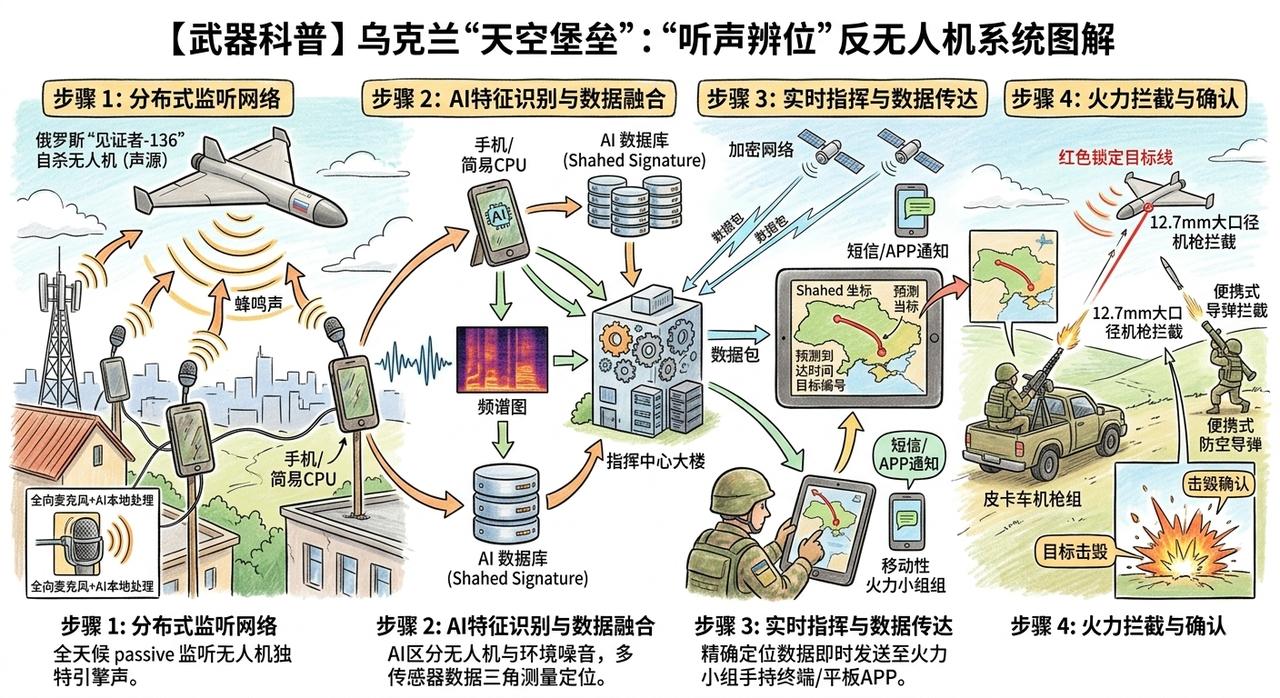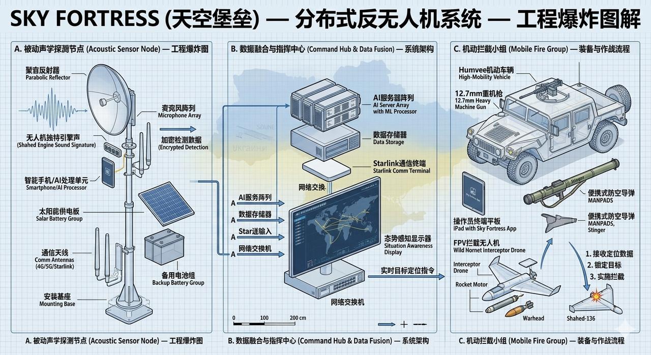 乌克兰的天空堡垒(Sky Fortress) 是俄乌冲突中诞生的创新型低成本声学空气防御系统。 它不是传统的雷达或导弹防御“堡垒”,而是一个全国性被动声学传感器网络。他们在全国各地的电线杆、屋顶布置了超过1.4万个由简易麦克风和手机组成的传感器,专门用于检测和跟踪雷达难以捕捉的低空威胁,如俄罗斯的Shahed自杀无人机、巡航导弹。 该系统通过“听声音”实现实时预警和定位,帮助移动射击小组以极低成本拦截目标,已成为乌克兰防空体系的重要补充,甚至吸引北约和中东国家关注。 2022年俄乌冲突初期,乌克兰雷达系统因早期打击而出现大量盲区,低空巡航导弹和无人机难以被传统雷达探测。两位乌克兰工程师在车库里快速原型化:用一根约2米长的杆子、一个普通麦克风和一部旧手机组合成简易传感器,就能“监听”Shahed无人机特有的“割草机嗡嗡声”。 该项目起初叫Zvook(乌克兰语“声音”之意),后来正式更名为Sky Fortress,并纳入乌克兰政府支持的Brave1国防创新平台。系统从第一代(手机作为处理器)快速迭代到第三代(定制CPU和声卡硬件)。 2022年10月首次实战部署,到12月已覆盖65%国土;目前已扩展到第三代传感器。