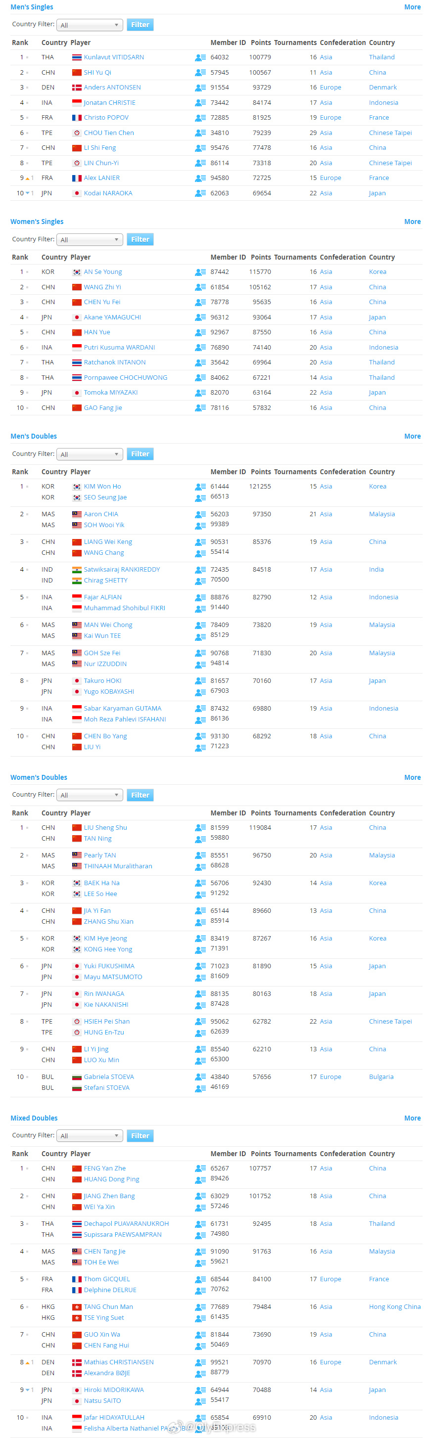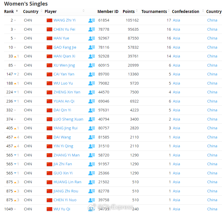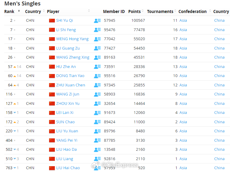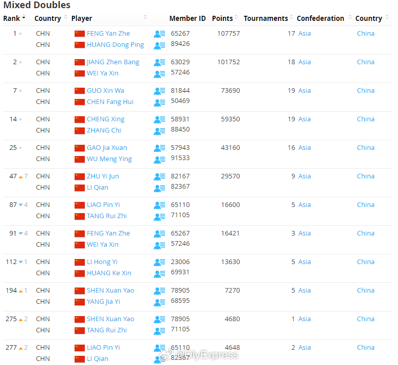 【世界羽联排名0324:胡珂源/林祥毅连升15级】世界羽联排名3月24日,世界羽