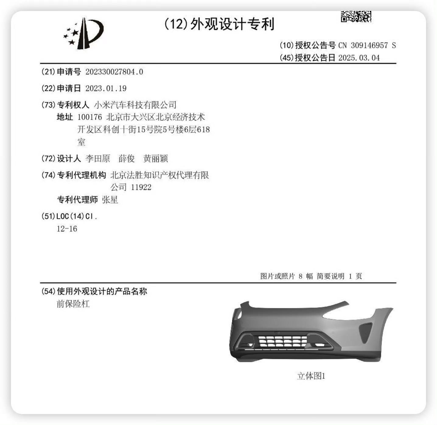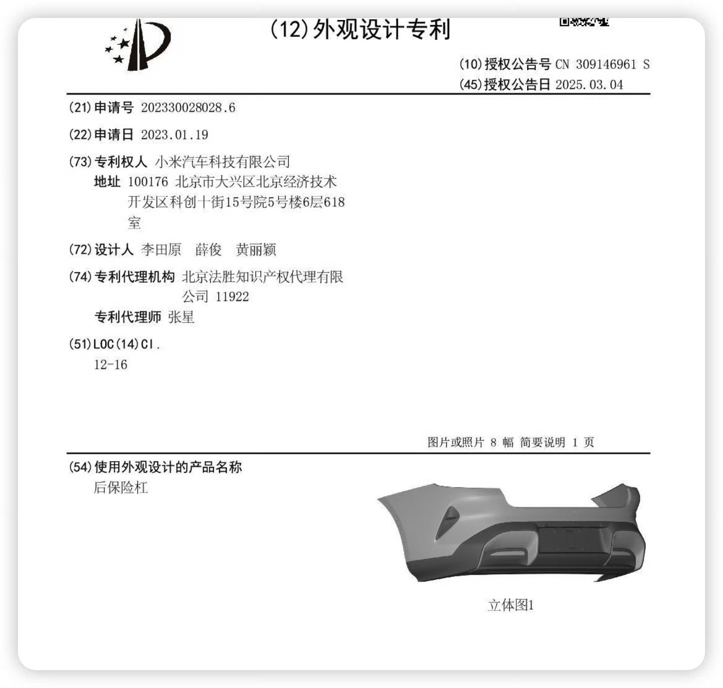 后保险杠、前保险杠、大灯的设计专利在2025年3月18日获得授权,2025年5月7日确认了外观专利的有效性。