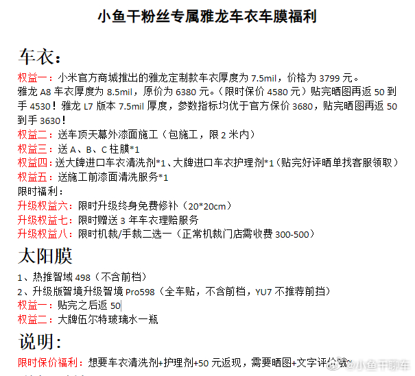 小米SU7交车太快了,很多小伙伴开始提车了,脚垫还没上架,急得脚垫哥团团转,先给大家上车衣,雅龙8.5厚度车衣到手4530,7.5到手3630,八大权益,包工包料,全国都可以贴。车衣哥来了