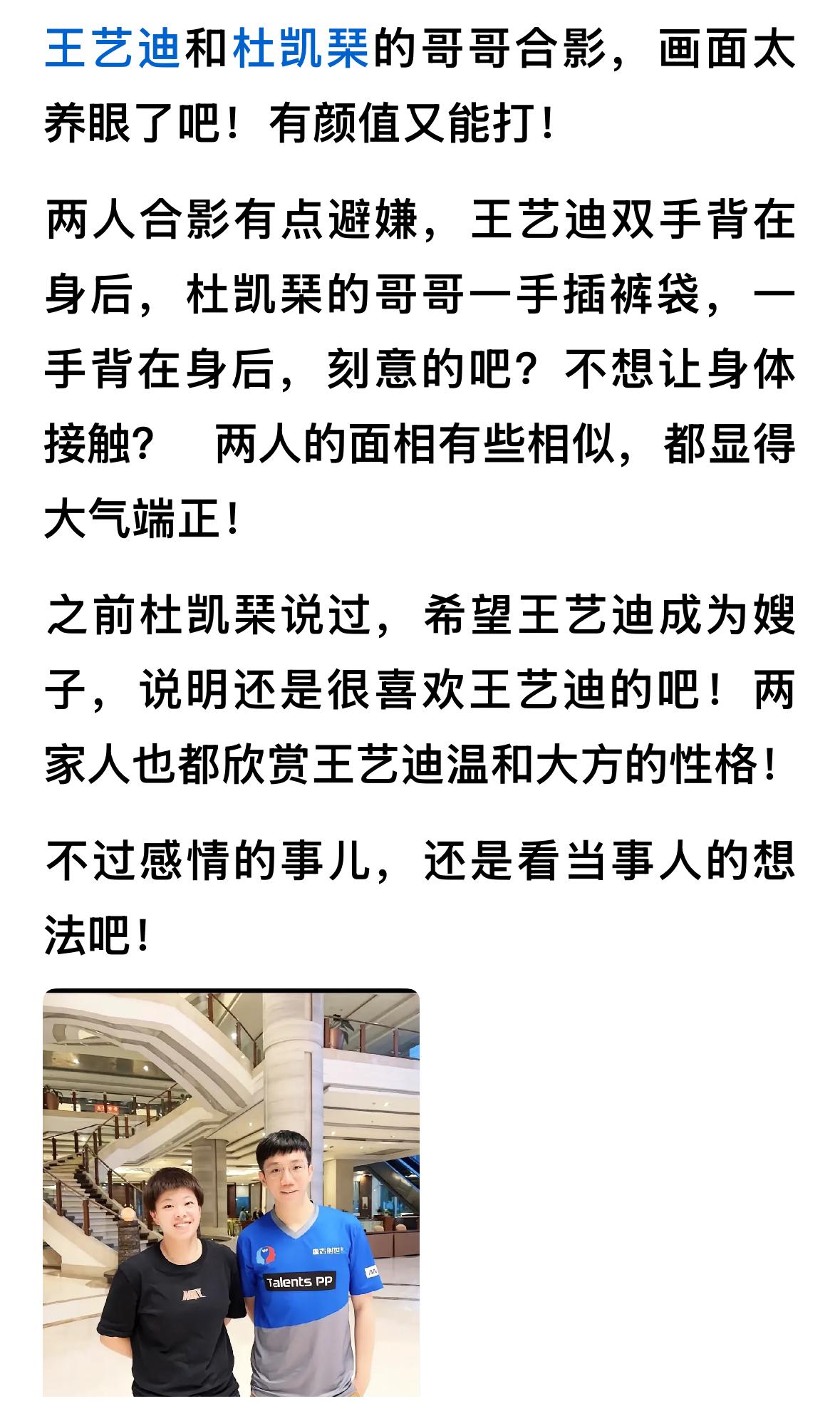 杜凯琹首次谈与王艺迪的关系:很小就认识,性格属于互补型! 3月24日,杜凯琹在谈到与王艺迪的关系时表示: “其实我跟大迪在很小的时候就认识, 小时候经常一起集训, 那时候经常看到, 就是不熟, 真正的熟悉是在2019年, 当时也是跟着国家队一起集训, 当时郭焱还在国家队, 她让大迪来照顾我, 因为我比较内向, 当时我不知道集合时间, 我也不敢问, 不熟的朋友,我就非常内向, 当时大迪就特别照顾我, 有什么事情就第一时间告诉我, 吃饭也带着我, 我们的关系也越来越密切, 我觉得大迪真的是一个很乐观, 很真诚,很实在,很靠谱的朋友, 我自己很敏感, 也会情绪化, 但我与大迪在一起就是性格互补那种,我可能补不到她, 但她一定会补到我吧哈哈😄……” 确实,两个人性格都很好, 大迪的性格乐观开朗, 确实能感染身边的人, 我也喜欢和这样直率的人相处, 大迪东北人, 大大咧咧,没啥心眼, 杜凯琹也有一颗有趣的灵魂, 愿她们友谊天长地久💑……