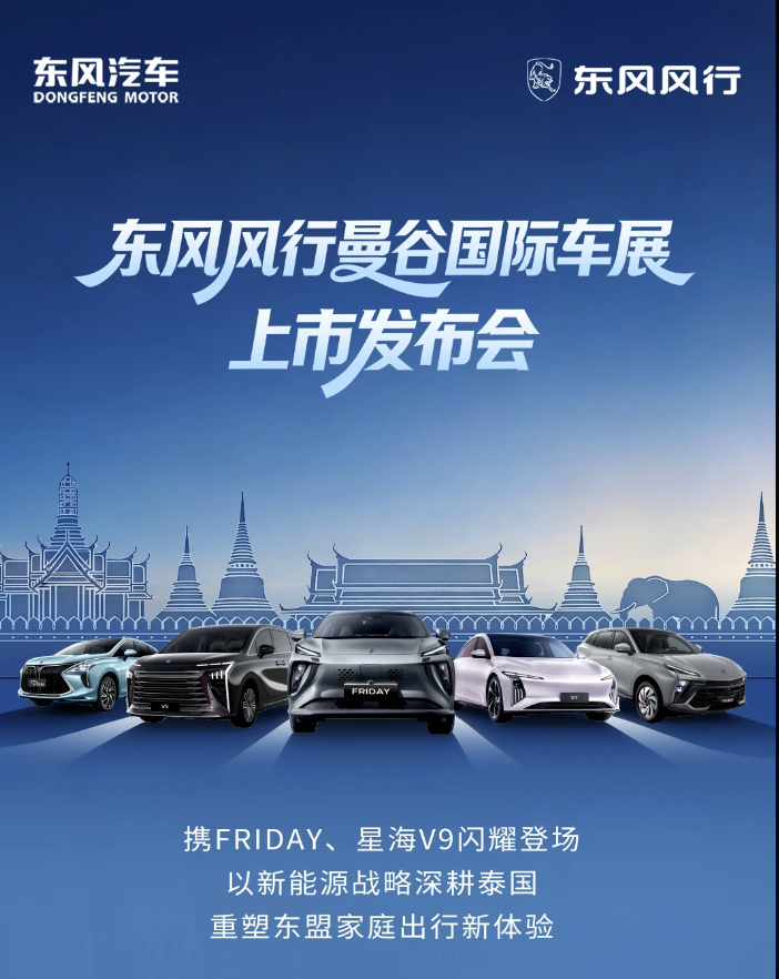 首秀泰国!东风风行携FRIDAY与星海V9亮相曼谷车展,瞄准东南亚市场。FRIDAY是进军泰国首款右舵新能源SUV,强化防水(IP67)与涉水能力,转向灵敏度提升21%,搭载增程系统。星海V9以大空间、智能座舱切入家庭与商务出行。从“产品出海”向“战略出海”跨越。东风风行