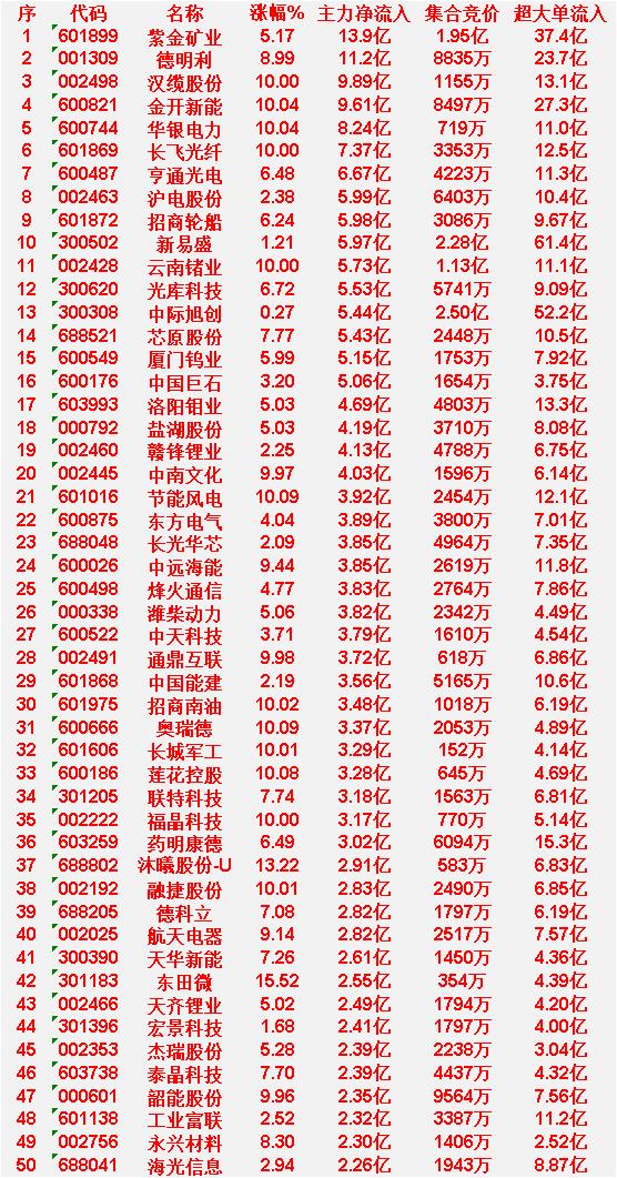 3月24日收盘,主力资金,已经大幅卖出的50名单: 排在第1位的是阳光电源,主力净流出13.8亿。 排在第2位的是三安光电,主力净流出8.39亿。 排在第3位的是华工科技,主力净流出7.08亿。 排在第4位的是兆易创新,主力净流出6.64亿。 排在第5位的是顺灏股份,主力净流出6.38亿。 排在第6位的是比亚迪,主力净流出5.91亿。 排在第7位的是东方新能,主力净流出5.74亿。 排在第8位的是协鑫集成,主力净流出5.50亿。 排在第9位的是中矿资源,主力净流出5.24亿。 排在第10位的是天孚通信,主力净流出5.01亿。 3月24日收盘,主力资金“大幅买入”的50名单: 紫金矿业:净流入13.9亿 德明利:净流入11.2亿 汉缆股份:净流入9.89亿 金开新能:净流入9.61亿 华银电力:净流入8.24亿 长飞光纤:净流入7.37亿 亨通光电:净流入6.67亿 沪电股份:净流入5.99亿 招商轮船:净流入5.98亿 新易盛:净流入5.97亿 云南锗业:净流入5.73亿 光库科技:净流入5.53亿 中际旭创:净流入5.44亿 芯原股份:净流入5.43亿 厦门钨业:净流入5.15亿 中国巨石:净流入5.06亿 洛阳钼业:净流入4.69亿 盐湖股份:净流入4.19亿 赣锋锂业:净流入4.13亿 中南文化:净流入4.03亿