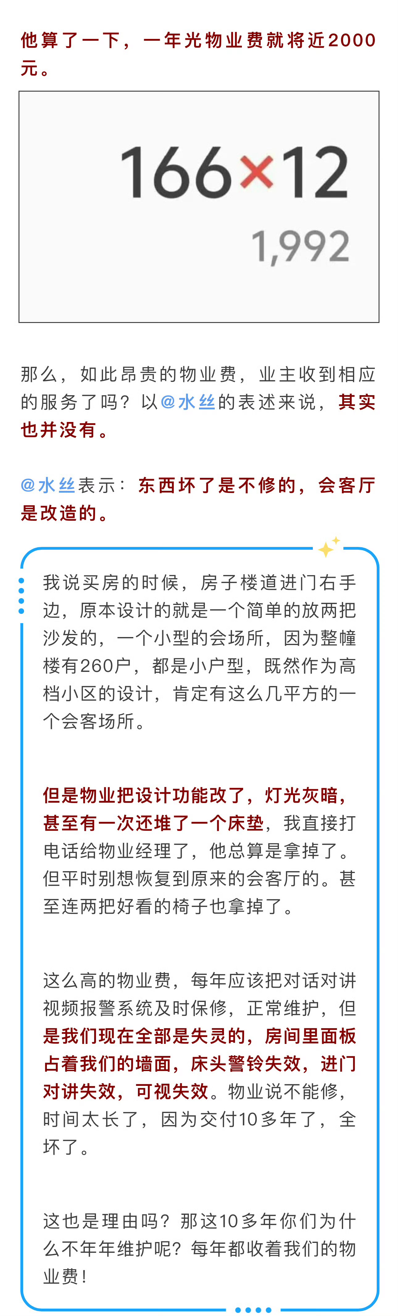 如此昂贵的物业费,业主收到相应的服务了吗?以“水丝”的表述来说,其实也并没有:东西坏了是不修的,会客厅是改造的。