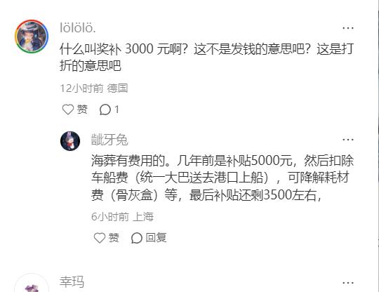 沪籍逝者选择海葬或深埋,可奖补3000元? 今天,刷到一个新闻,说是上海市推出新政:沪籍逝者选择海葬或深埋,可奖补3000元。 有意思的是,我后面又刷到过一个海葬的视频,评论区的网友们倒是挺有意思。 说什么被海葬的家人托梦说冷。 当然了,这只是调侃。 很多网友关心更多的是:这会不会污染环境? 甚至还有网友表示,以后不会全国推行吧? 就我个人来看吧,海葬是很难全国推行的,要知道咱们的国土大多都在内陆地区。 或许,多年之后,海葬会在沿海地区普及吧。