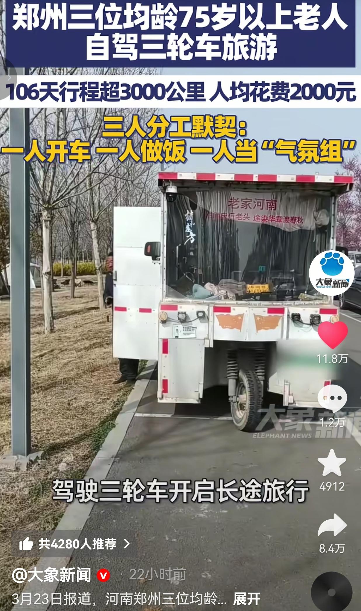 这三位河南老爷子直接把日子过成了诗!平均75岁!郑州仨老头开三轮车逛遍大半个中国,看完我脸都红了! 河南郑州,三位平均年龄75岁的老头,攒了辆改装三轮车,说走就走!106天,跑了3000多公里,从河南一路晃到湖北、江西、广东,甚至还在福建过了个年,人均才花2000块! 你敢信?他们吃住全在这小三轮上:一人负责握方向盘稳方向,一人掌勺做饭管温饱,还有个老爷子当“气氛组”,拿着话筒一路唱红歌、讲笑话,把枯燥的旅途闹得热热闹闹。 路上饿了,就蹲在路边架起小铁锅,炖一锅热乎菜;累了,就把车停在公园角落,裹着被子凑合一晚;甚至过年回不了家,福建当地的老乡直接拉他们去吃年夜饭,暖得老爷子们红了眼。 有人劝他们“都一把年纪了,别再瞎折腾了!”可他们说:“趁还能走,多看看世界,总比在家躺着强!”现在休整完,还计划开着这小三轮往东北去避暑! 网友们看完直接炸锅!有的网友说:“我爹72,天天在家唉声叹气说自己老了没用,看看这三位!明天就拉他去报老年大学! 也有的网友说:“破防了!我30岁天天喊着“说走就走”,结果连隔壁市都没去过,人家75岁已经逛遍大半个中国了!” 还有的网友说:“这才叫活明白了!不是有钱才能旅行,是有勇气才能出发!” 也有的网友说:“2000块跑106天?比我在北京租房子还便宜!这才是真正的穷游天花板!” 现在的人啊,年纪轻轻就喊“躺平、摆烂”,说什么“没钱没时间”,可这三位老爷子用行动抽了我们一巴掌:老不可怕,可怕的是心先死了! 你以为人老了就该围着子女转、守着灶台过?错!他们用一辆破三轮告诉我们:人生从来没有“太晚”,只要你想出发,75岁照样能看遍山河! 那些说“年纪大了折腾不动”的人,不过是给自己的懦弱找借口——你连尝试的勇气都没有,凭什么抱怨生活没意思? 这世上最酷的从来不是开豪车、住豪宅,是你到了75岁,还能像个少年一样,攥着方向盘说:“走,咱们去看看世界!” 别再等“以后”了,今天就是你最年轻的一天,想做的事现在就去做,别等老了才后悔:“我本可以……” 年龄从不是束缚,不敢出发的人才是真的老了! 对此,你怎么看?