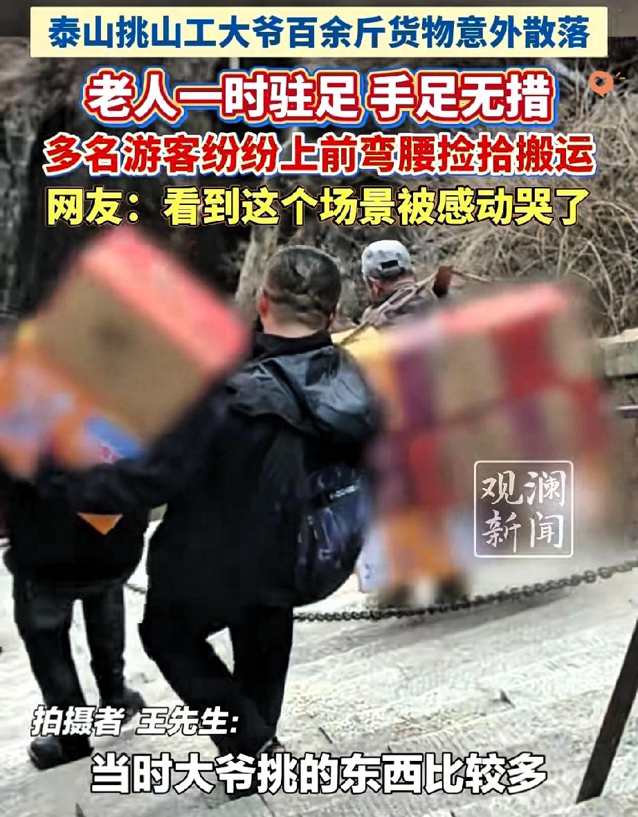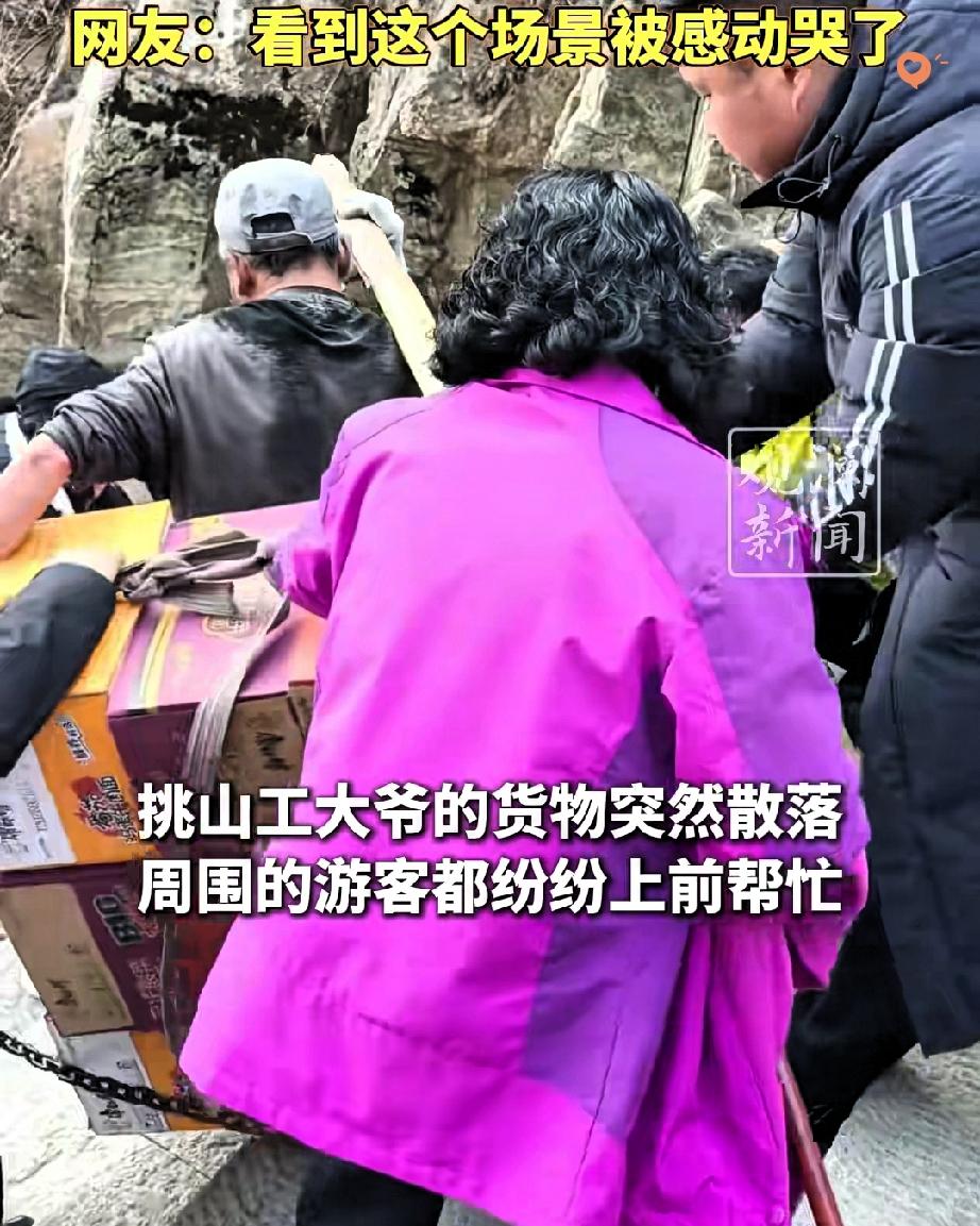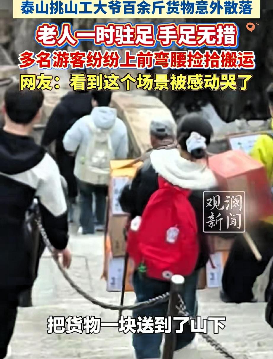 泰山山道上这一幕,真的看一次暖一次! 挑山工大爷的货担突然散架,方便面滚落一地,本以为会有人趁乱捡拾,结果游客们的反应太戳心了。 大爷汗湿的衣衫紧紧贴在身上,看着滚落的货物急得手足无措,要知道泰山挑山工步步都靠力气换生计,这一担货或许是他一整天的辛苦。 没想到游客们二话不说,有的冲上去稳住剩下的担子,有的弯腰追着捡方便面,还有人提议“一人扛一箱”,瞬间组成了一支暖心的“送货队”。 其实旅途中最美的从来不是风景,而是陌生人之间不掺杂质的善意。 这些游客用行动证明,善良从不是刻意表演,而是刻在骨子里的本能。 你在旅途中遇到过这样的暖心瞬间吗?