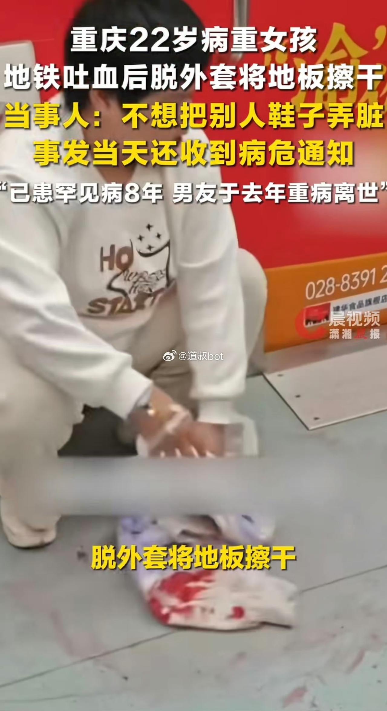 重庆地铁衣服擦血的女孩悲惨身世曝光,其病逝的前男友给他留下的遗书更是让人泪目。 女孩叫胡馨瑶,出生于 2003 年身患罕见的血管炎。在地铁上面吐血,是因为消化道出血,应该和她的病情有关。女孩为了不影响大家,不得不用自己的衣服把血迹擦拭干净,这是一个讲究和体面的女孩。 她的前男友是一名辅警,他们相识于 2024 年,前男友说和女孩在一起度过度过了一段快乐的时光,可是太短暂了。曾经男友两次向女孩求婚,都被女孩拒绝了,不是因为不爱他,而是女孩怕拖累男友,不得已才残忍的拒绝。 分手后女孩独自生活治病,可是前男友却突发急性胰腺炎去世了,去世之前前男友把自己积攒的 5 万块钱通过朋友转交给女孩,希望完成女孩建立病友之家的心愿。两个人都有情有义,可是天妒红颜,没有让两个相爱的人最终走到一起,老天爷就是如此的不公。