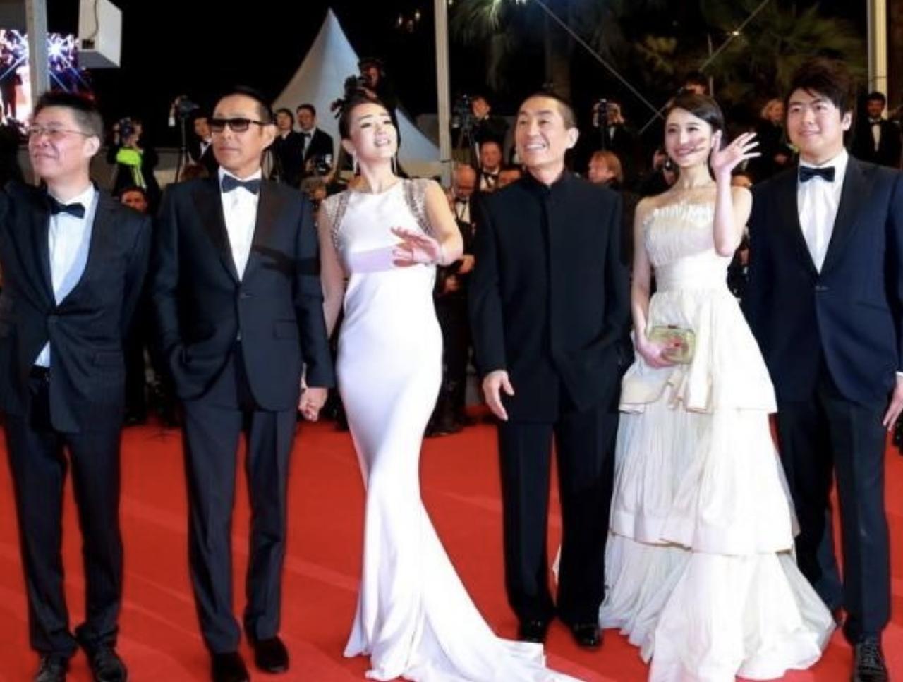 2014年,导演张艺谋带电影《归来》演员,现身戛纳电影节的画面。 巩俐一袭白色