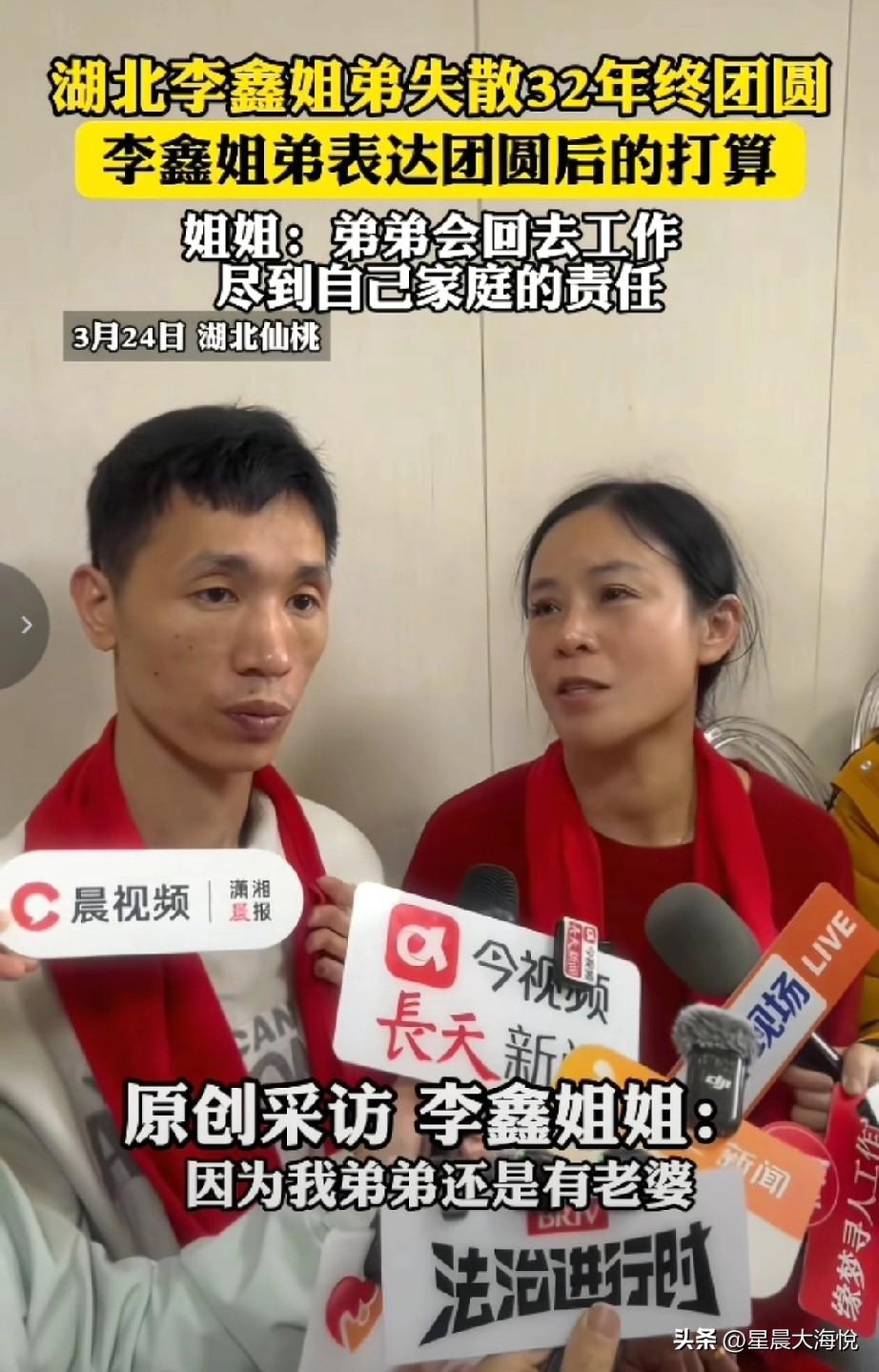 湖北李鑫姐弟俩认亲后的打算, 姐姐说,因为她弟弟是有老婆有小孩有家的,那么就必须要承担一个父亲的责任,还有一个丈夫的责任,所以呢,我们认亲了,弟弟该回去工作还是回去工作 姐弟俩的打算是对的,毕竟湖北老家那边已经没有什么亲戚,弟弟都是他们老李家代代相传。 也有网友说:他弟弟还是想回去养父母那边,毕竟那么多年感情还是很深厚的,养父母给及他父爱母爱温暖家庭