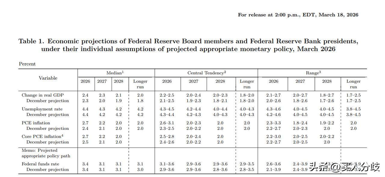 从预测图来看,本年还有一次降息预期,与之前的两次有所降低,这也是导致大跌的根本原因!现在美联储面对通胀和美伊双重压力,经济即将陷入困境,降息不能降,加息也不敢加,可能陷入滞胀困境!