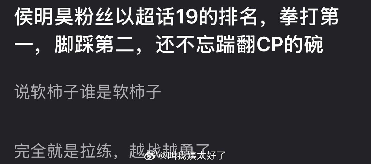 有网友说侯明昊粉丝以超话19的排名,拳打第一,脚踩第二,还不忘踹翻CP的碗,完全就是拉练,越战越勇了