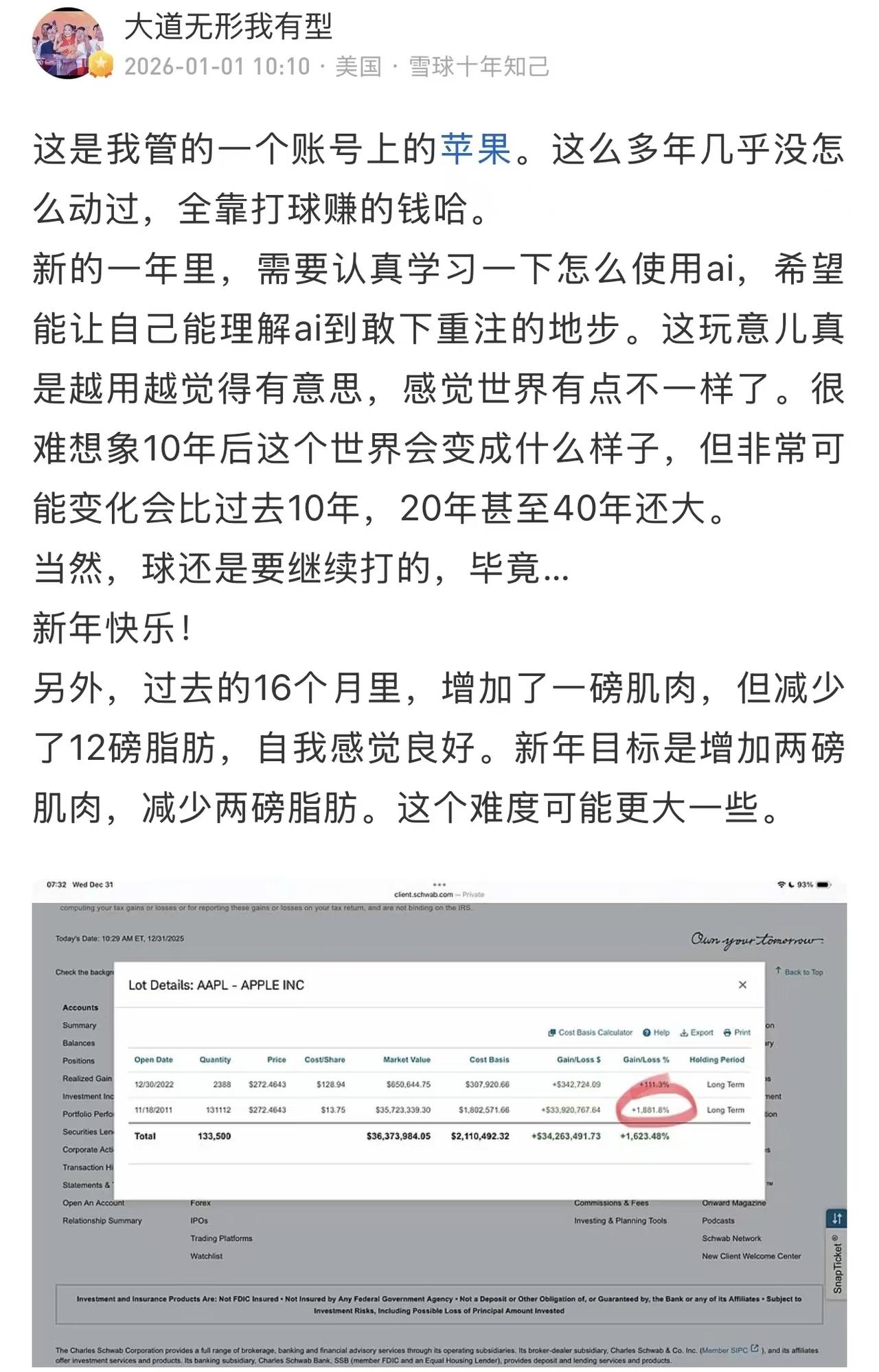 14年18倍,段永平再度封神! 这两天许久不露面的段永平,再度刷爆朋友圈。他晒出的一个账户成绩单显示,14年豪赚18.81倍。该账户满仓单押苹果公司,自2011年11月18日开始买入,总耗资180.26万美元,截至2025年末,盈利3392.08万美元,总回报1881.8%。 你不得不感叹:大佬就是大佬!普通人难以望其项背! 让人折服的不仅是段永平单一重仓一只苹果的精准眼光和魄力,更是长达14年的超级耐心。 这也让庖丁姐想到了另一位投资大师霍华德马克斯的告诫:投资在于时间,而不是时机;财富是熬出来的,不是炒出来的! 就像段永平在持有苹果的14年间,既经历过一年2倍的上涨,也经历过50%的回撤,而段永平一股未卖。放弃赚波动的钱,才能享有时间带来的回报。 此时此刻,庖丁姐看看自己的账户,每次的高抛低吸,以为自己可以精准的把握时机,事后来看,带来的都是懊悔。 比如,腾讯。我曾在300元以下买入,中间几次股价涨到400然后又跌回300,我都没卖,反复坐过山车,于是,我下决心,下次涨到400元我就卖掉,然后等跌回300我再买入。结果大家都看到了,今天的腾讯已经超过600元,而我早早的就与它无缘了。——普通人不明白:卓越的公司与普通的公司不同,它会不断创造新高,它自己就拥有成长的内驱力。 再比如,中国平安。在去年12月5日的时候,单日涨幅曾高达5.88%,我自作聪明的在58元附近落袋为安,生怕第二天回撤错失到手的盈利,结果第二天它继续涨,第三天仅有微弱调整,此后股价继续突破,再创新高。我追悔莫及,后面以68元买回来,这就是普通人在牛市中赚不到钱的真实写照了。你梦想的高抛低吸,最后换来的却是拉高的成本。——低位大涨不意味着落袋为安,而是上涨的势能压不住了,突破后会再创新高。牢牢抱住强势上涨的股票,这才是顺势而为。 再比如,招商银行。从7月份至今回撤已达15%,指数一路高歌猛进,而我的招行却冰冷的像另一个世界。中间几次下跌,我真想下车。但随着1月份中报分红到账,我算了一下我的股息率已经超过10%了。真是失之东隅收之桑榆。——优秀的公司,即便经历低谷,也会以另一种方式给投资人弥补。比如,提高分红率、股票回购等。 段永平说过:遇到好公司,买定离手就是普通人最好的操作。 一个老鸟曾告诫庖丁姐:什么时候,当你放弃高抛低吸的念头的时候,价值投资才算入了门。