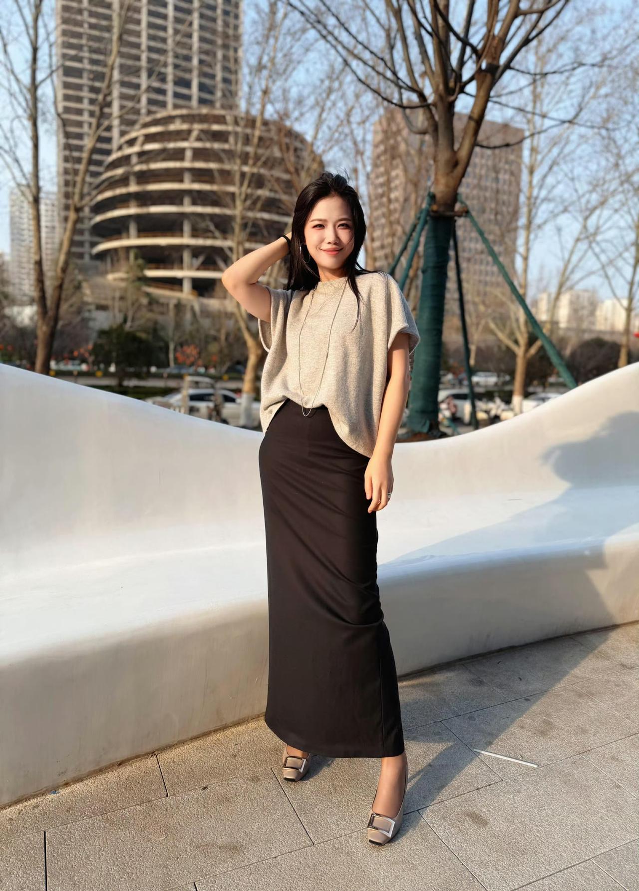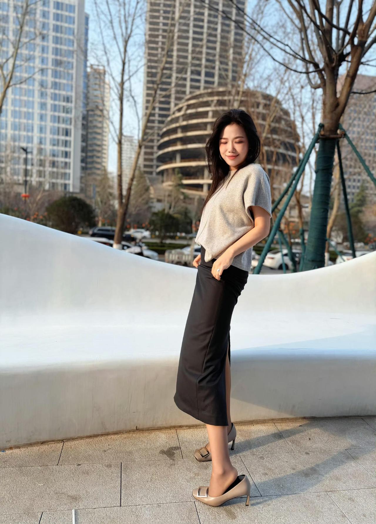 这套是松弛优雅通勤风,核心是浅灰短袖针织+黑长开叉裙的搭配:宽松针织自带松弛感,