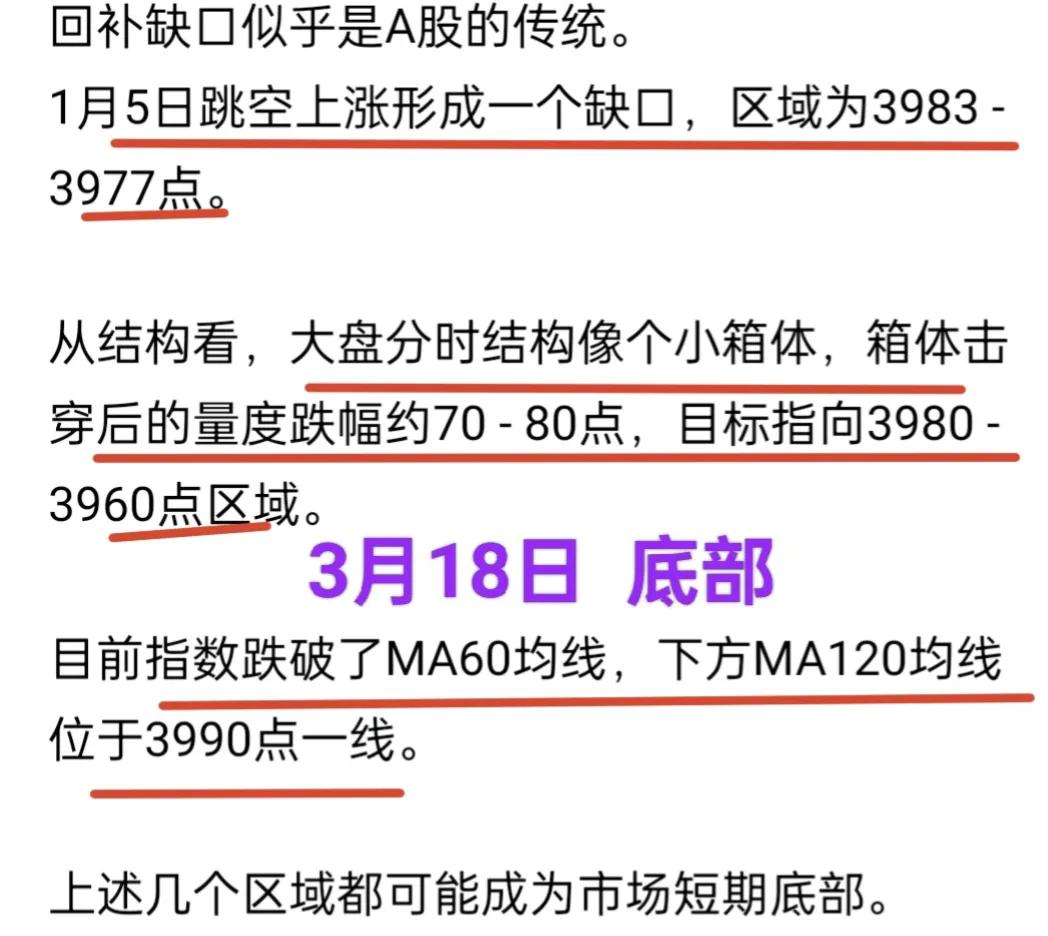 A股:该破就破,破而后立!资金只见流出不见流入,不砸出个坑,谁会进场? 4000点还是失守了,距离那个缺口仅差10余点。 1,银行板块 3月11日,渔夫提及银行板块。 当时渔夫有两个观点: 其一,银行板块上涨并非好事。 其二,银行板块的股息率水平对长期资金有吸引力(可考虑配置)。 银行板块上涨意味着市场进入休整期,同时会挤压其他方向的资金。 2,底部区域 3月18日,渔夫从多个角度分析了大盘可能的底部区域。 一是1月5日的缺口(3983~3977点)区域。 二是MA120均线区域(3990点一线)。 三是根据大盘分时结构的箱体形态得出的量度跌幅,目标指向3980~3960点区域。 上述三个区域相差不大。 3,抄底? 今日盘中跌破4000点,最低至3994点。 沪深两市成交金额2.10万亿,昨日为2.02万亿,成交量放大约800亿。 放大的成交量主要集中在早盘和尾盘,表明尾盘有资金抄底。 不过,今日的下跌如同挤牙膏,不像是已到底部的表现。 明日是周五,也是交割日,预计还会有一跌。 明日下午,或者下周,或许会再次出现短线底部。 个人观点,仅供交流,不构成投资建议!理财有风险,投资需谨慎! 大盘分析行情