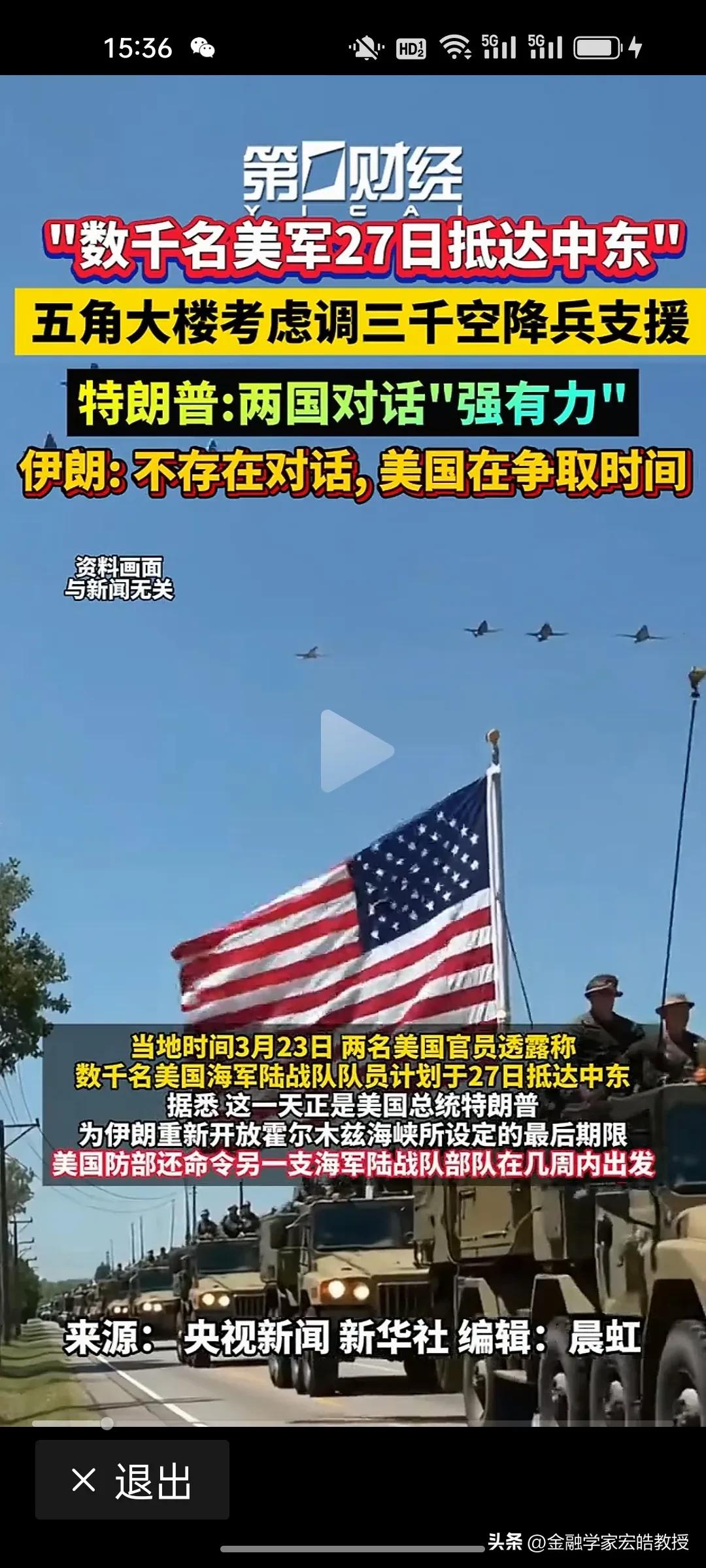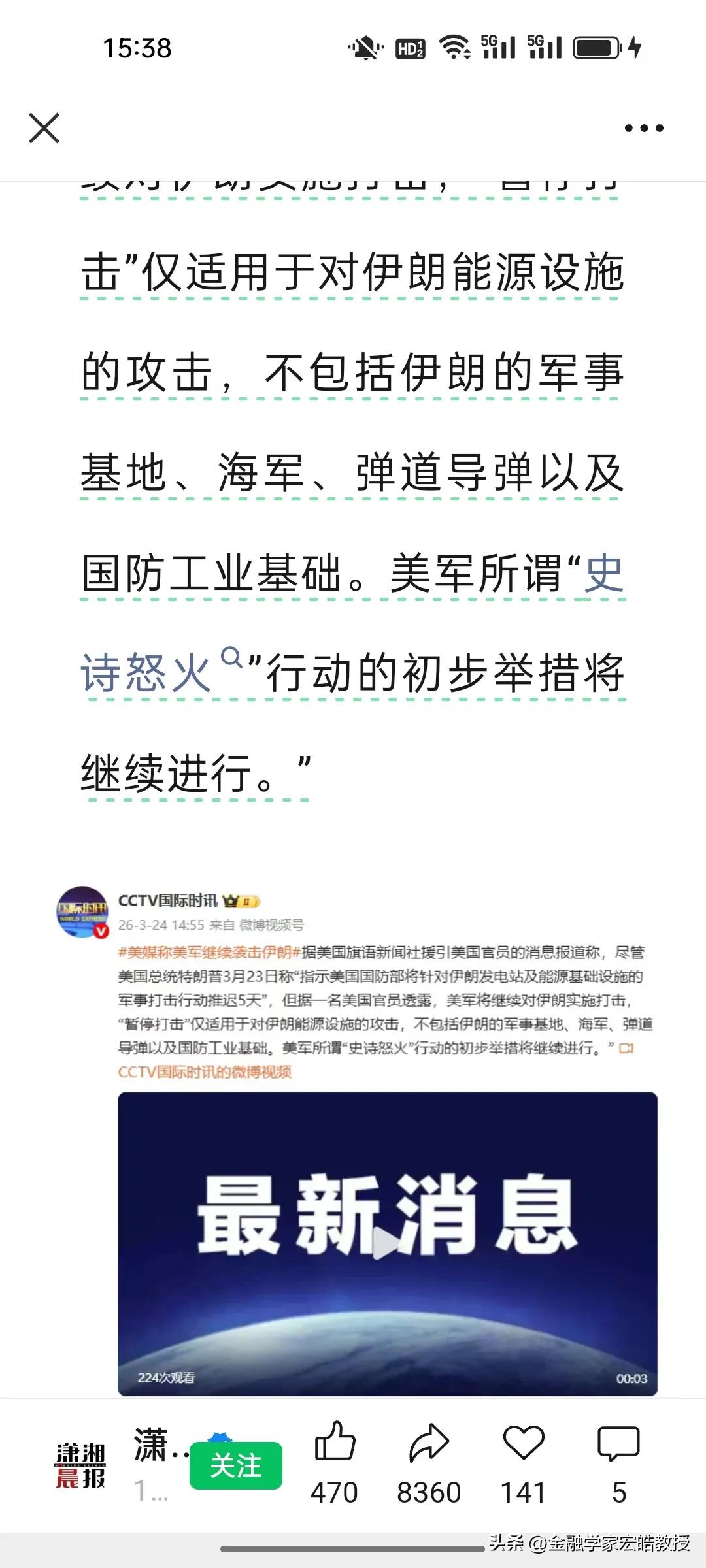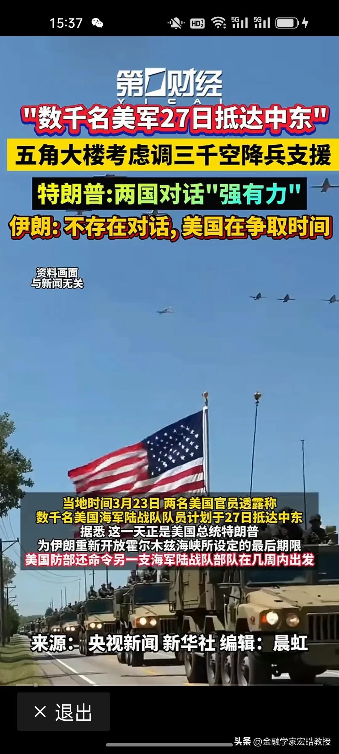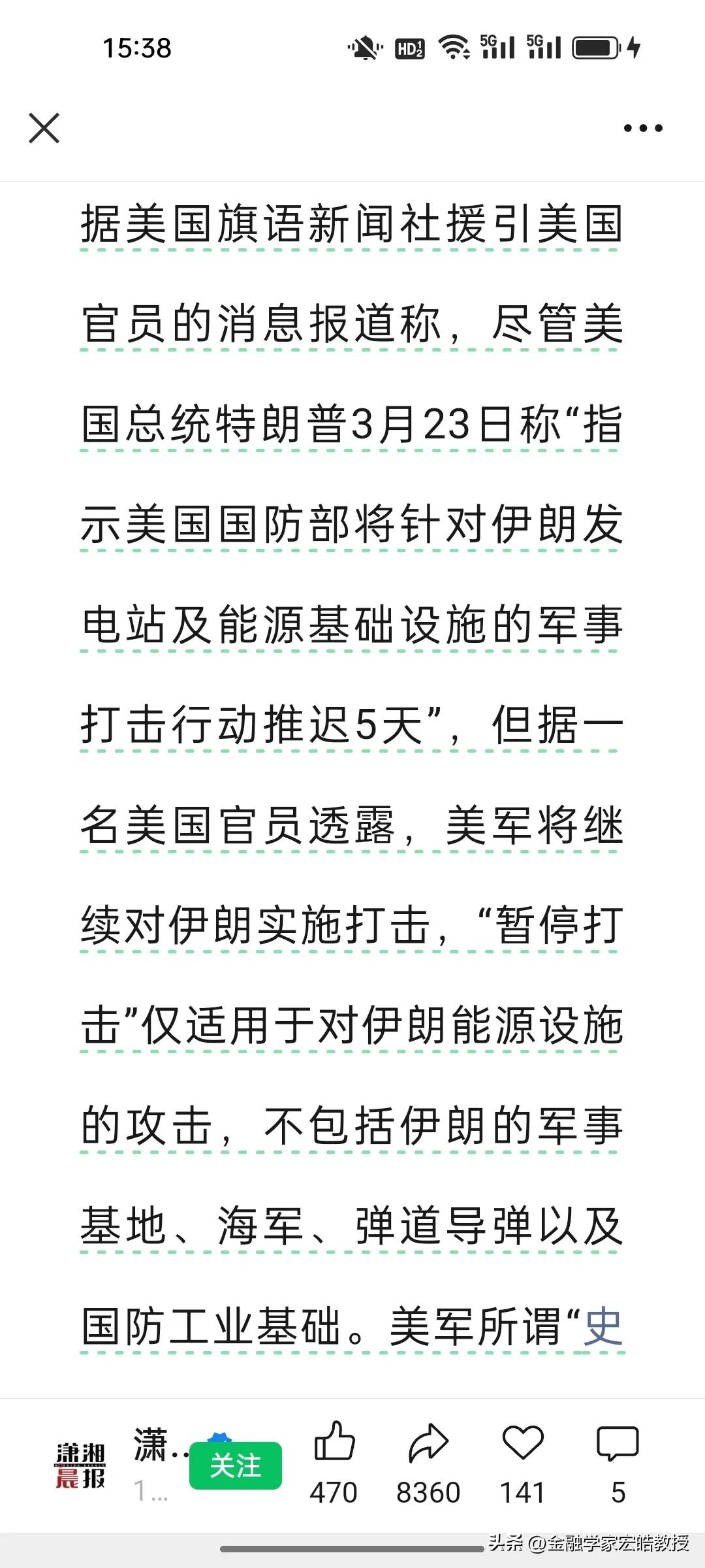美伊冲突并未停歇,特朗普称暂停打击伊朗能源设施5天,并没有说完全停止战争5天。刚刚,美军证实了军事目标打击仍在继续。美军已增派数千名海军陆战队于27日抵达中东,还考虑调派3000名空降兵支援。 今天,美方说了4月9日被定为结束战争的目标日期,留给双方的时间仅剩两周。因此在这个时间段还是以打促谈的格局不会变。 美国一边军事施压,一边急于通过谈判达成协议,特朗普今天说了,快要拦截不住伊朗的导弹了。一大早七点就释放强烈和解信号,尽管遭到了伊朗方面的全面否认,特朗普本质是想通过谈判规避军事失败风险,现在也不提什么要跟迭伊朗政权了,也不要夺霍尔木兹海峡了,更不要各盟国去护航了,还主动给战事降温,不打伊朗的能源设施5天。特朗普现在更倾向于尽快跟伊朗回到谈判桌达成协议。 另外,眼看着普京就要访华了,特朗普因为这场消耗战耽搁了原本安排好的访华行程。打了一场啥羊毛也没薅着的战争,现在特朗普的心里估计肠子都悔青了,可那不服输的个性,只能自导自演,催着伊朗赶快进入谈判进程。